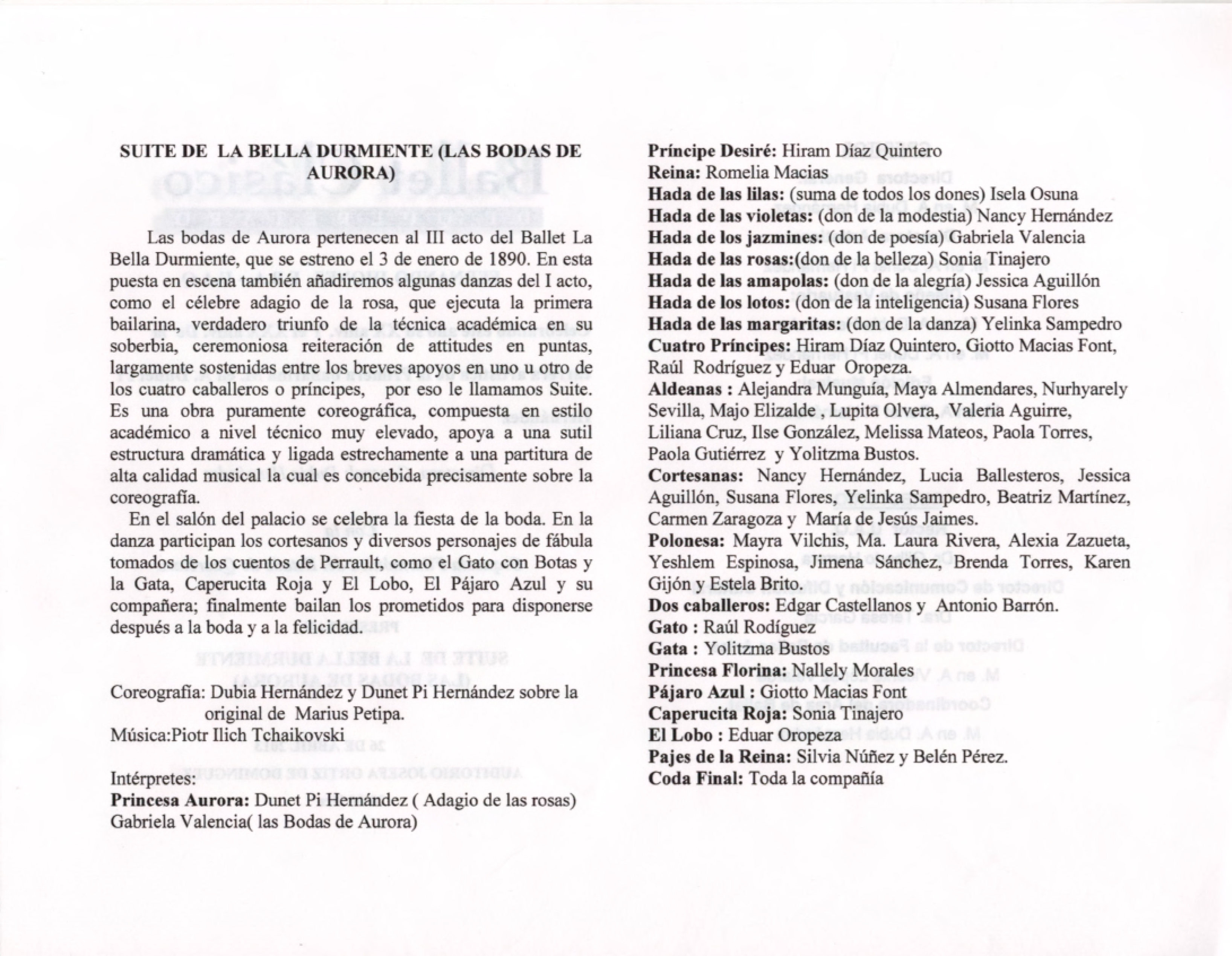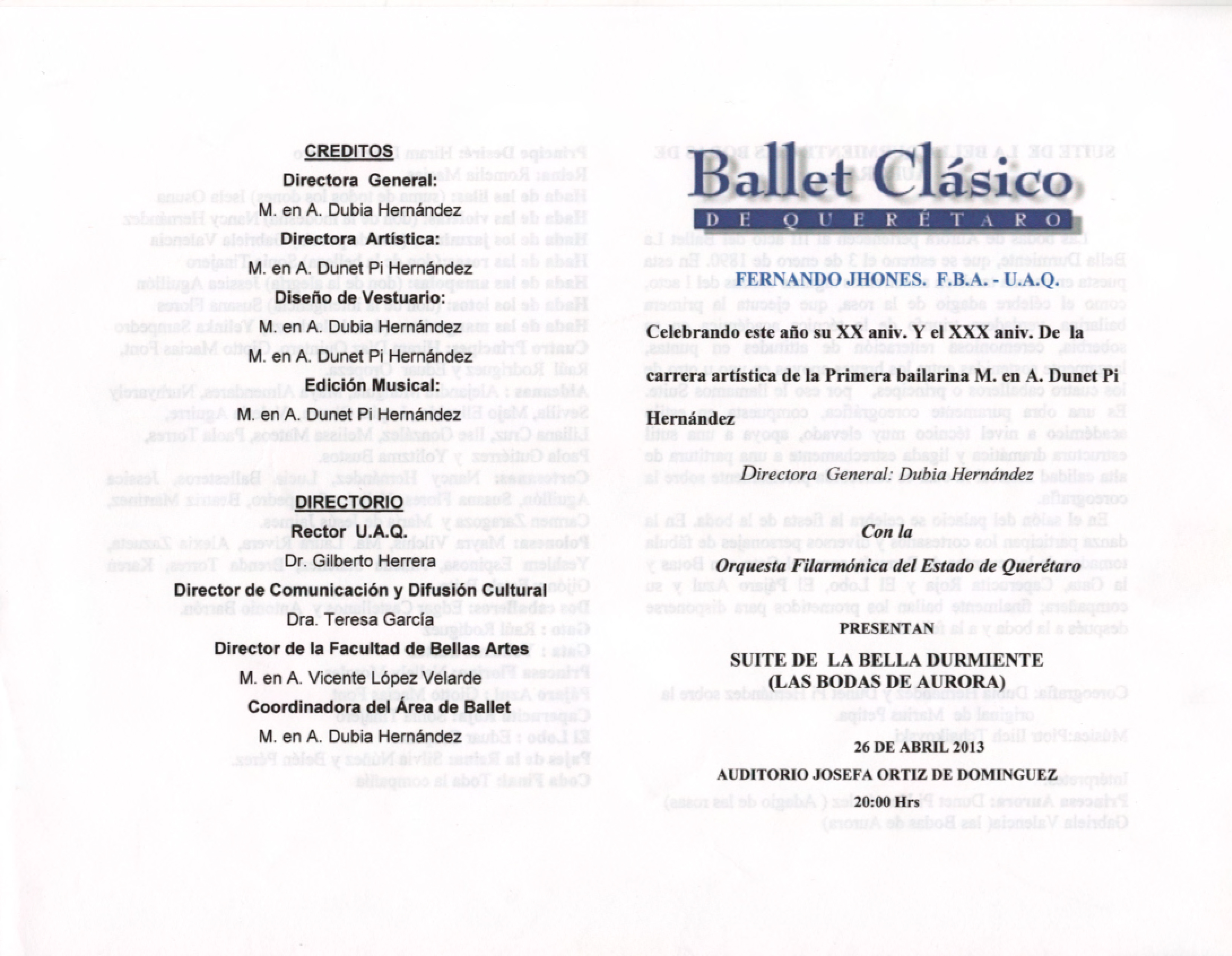 Programa del XX aniversario del Ballet Clásico y el XXX aniversario de la Primera Bailarina Dunet Pi con la OFEQ presentando la Suite de la Bella Durmiente, el 26 de abril de 2013 en el Auditorio Josefa a las 20 hrs.