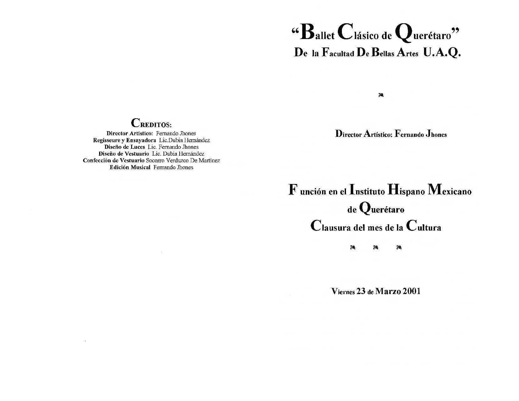 Programa para la función del Ballet Clásico de Querétaro "Fernando Jhones" en la clausura del mes de la cultura del Instituto Hispano Mexicano de Querétaro.
