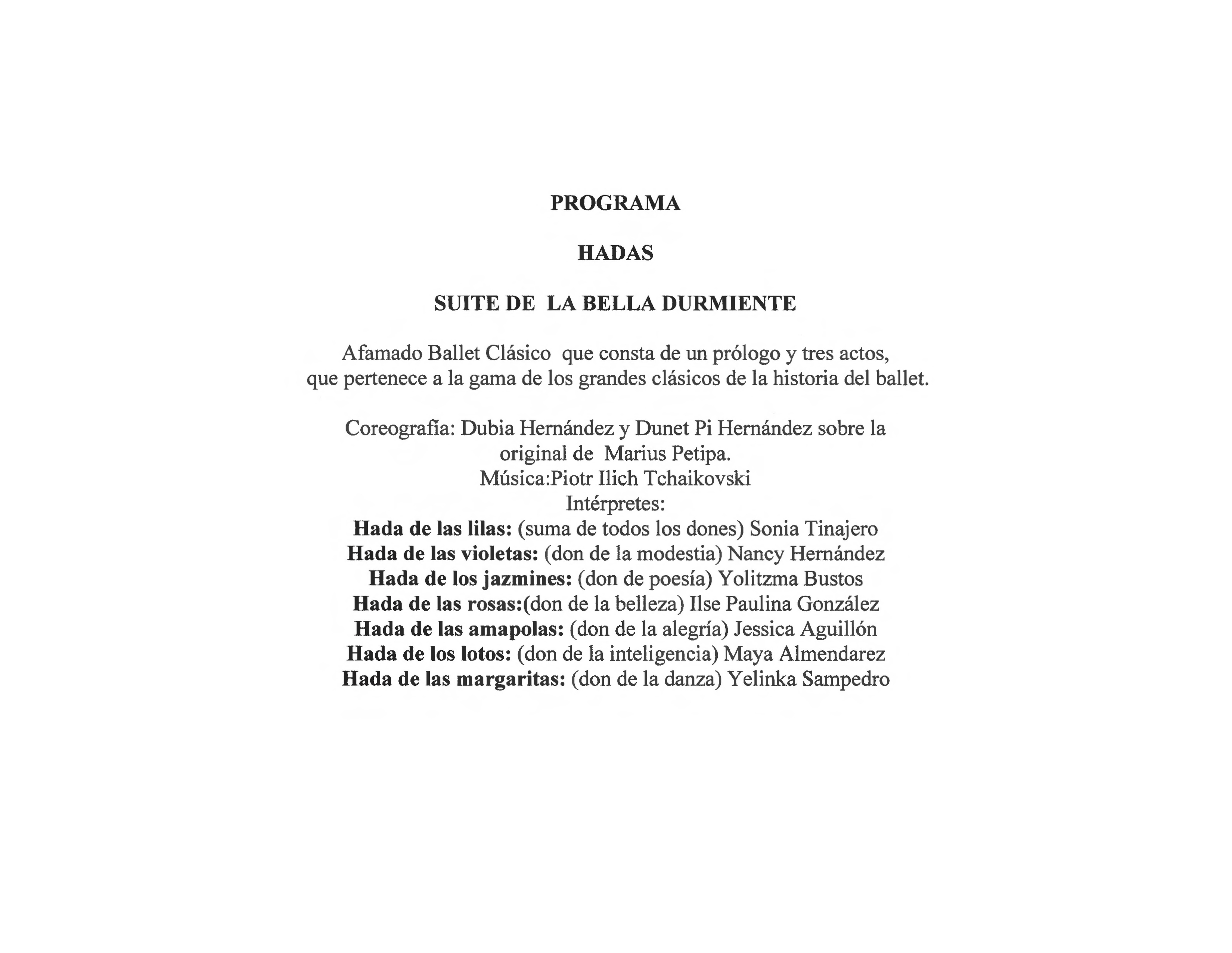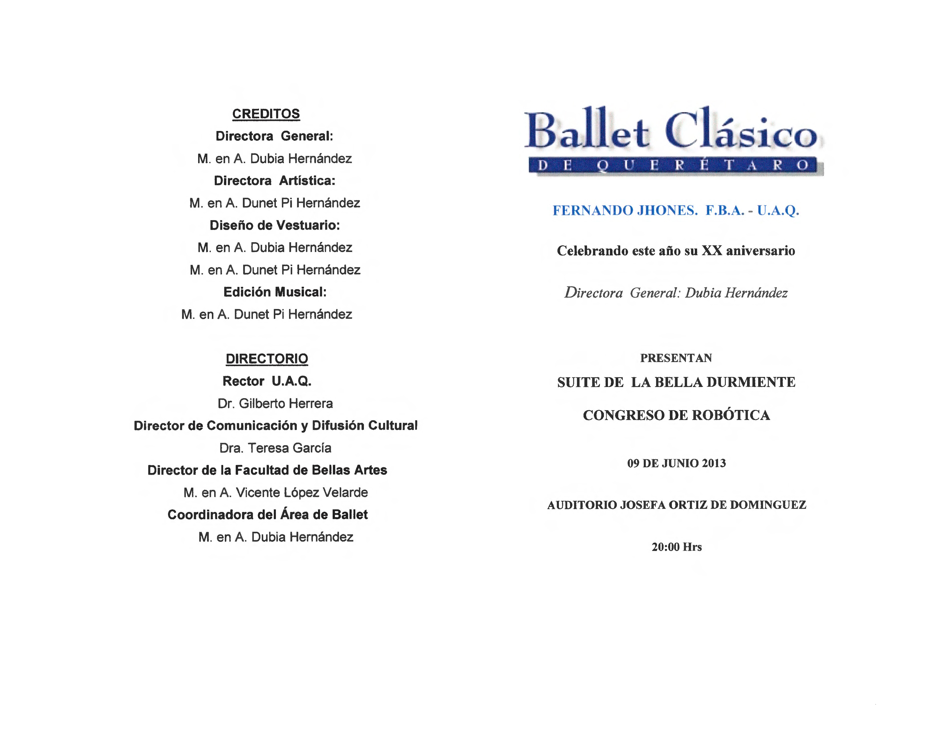 Programa del XX aniversario del Ballet Clásico con su directora gral. Dubia Hernández; presentando La Bella Durmiente en el Congreso de robótica el 9 de junio de 2013 en el Auditorio Josefa a las 20 hrs