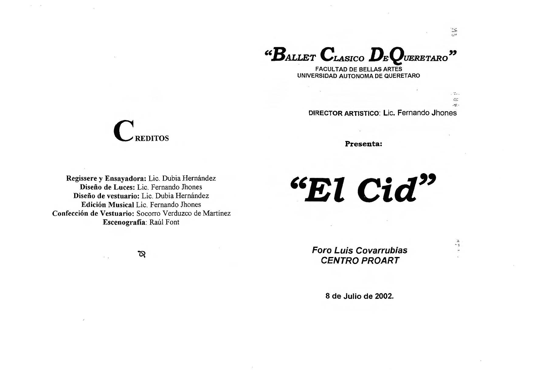 Ballet Clásico de Querétaro Fernando Jhones, “El Cid en el Centro Proart,” ReDCA-Ballet, consulta 9 de marzo de 2026, http://redca.uaq.mx/ballet/items/show/408.