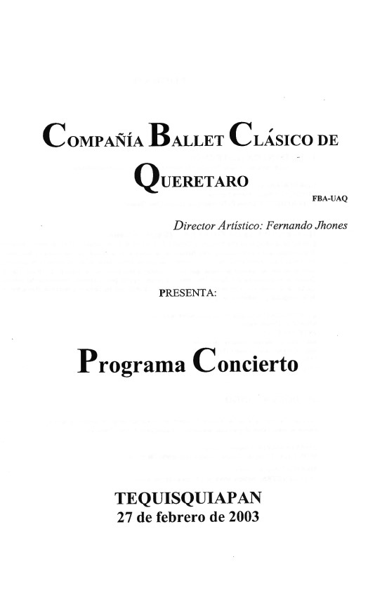 Ballet Clásico de Querétaro Fernando Jhones, “Programa Concierto Tequisquiapan,” ReDCA-Ballet, consulta 9 de marzo de 2026, http://redca.uaq.mx/ballet/items/show/423.