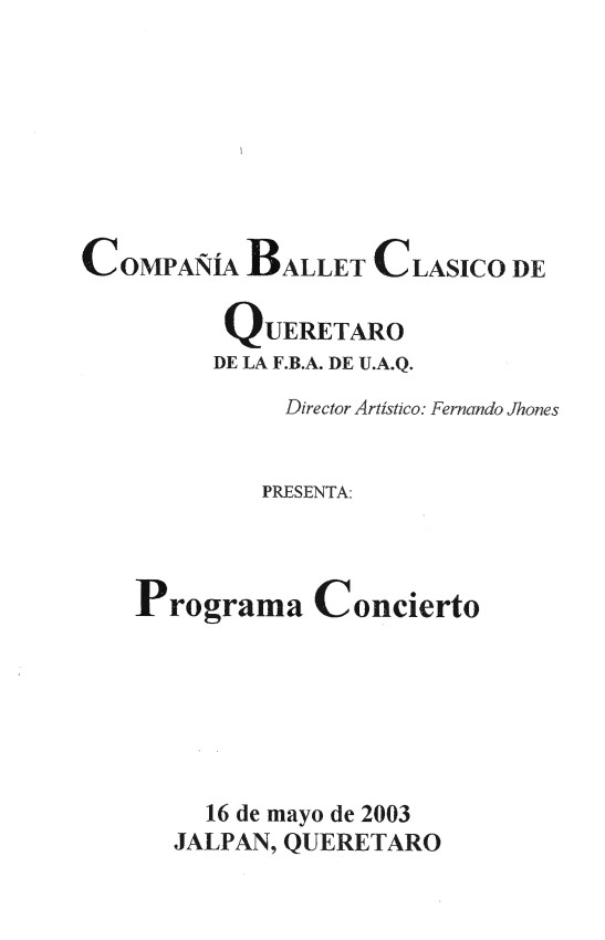 Ballet Clásico de Querétaro Fernando Jhones, “Programa Concierto Jalpan,” ReDCA-Ballet, consulta 9 de marzo de 2026, http://redca.uaq.mx/ballet/items/show/425.