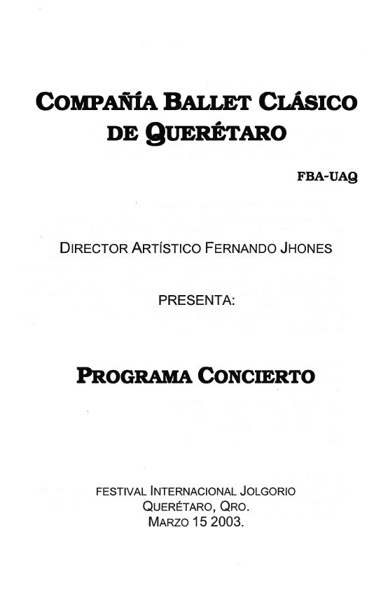 Ballet Clásico de Querétaro Fernando Jhones, “Programa Concierto Festival Internacional Jolgorio,” ReDCA-Ballet, consulta 9 de marzo de 2026, http://redca.uaq.mx/ballet/items/show/428.
