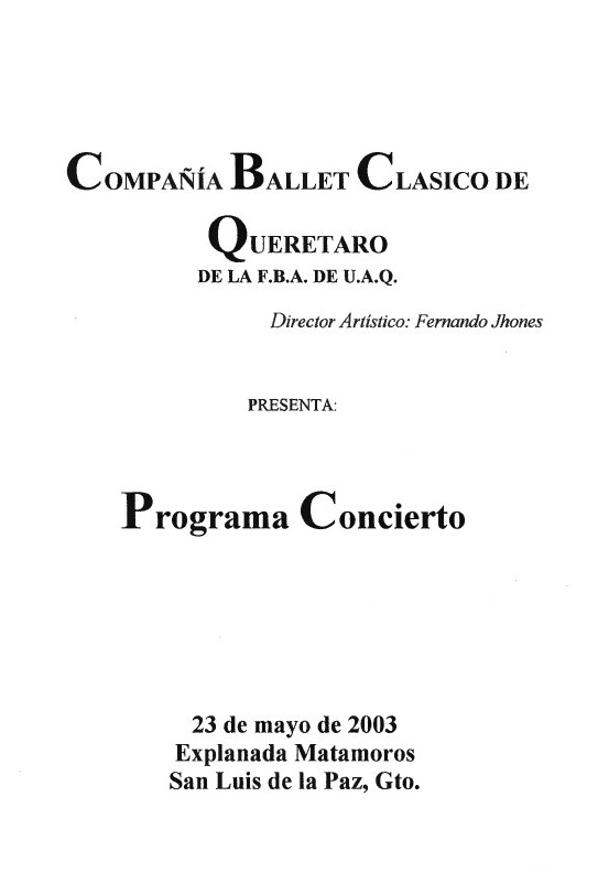 Ballet Clásico de Querétaro Fernando Jhones, “Programa Concierto San Luis de la Paz,” ReDCA-Ballet, consulta 9 de marzo de 2026, http://redca.uaq.mx/ballet/items/show/430.
