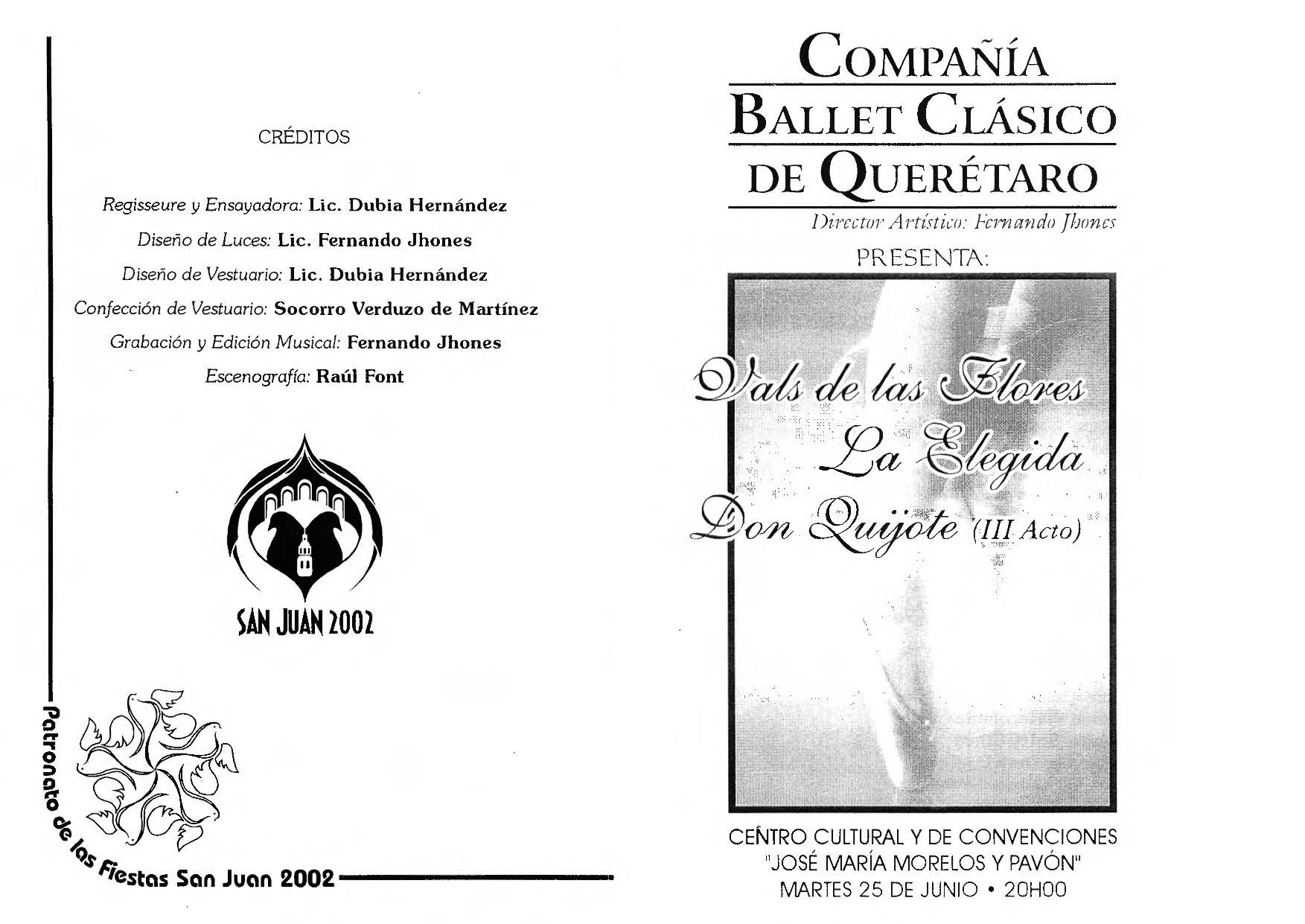 Programa de eventos del Patronato de las fiestas San Juan 2002.En donde se presentó Vals de las Flores La Elegida Don Quijote (III Acto).