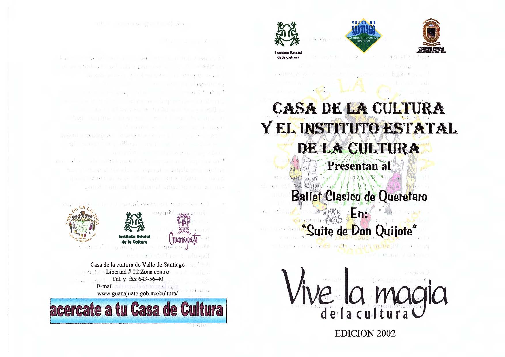 Resumen de una función del Ballet Clásico de Querétaro "Fernando Jhones" titulada Vive la magia de la cultura Suite Don Quijote. La función de ballet clásico se llevó a cabo en el 2002 en la Casa de la cultura de Valle de Santiago Libertad.