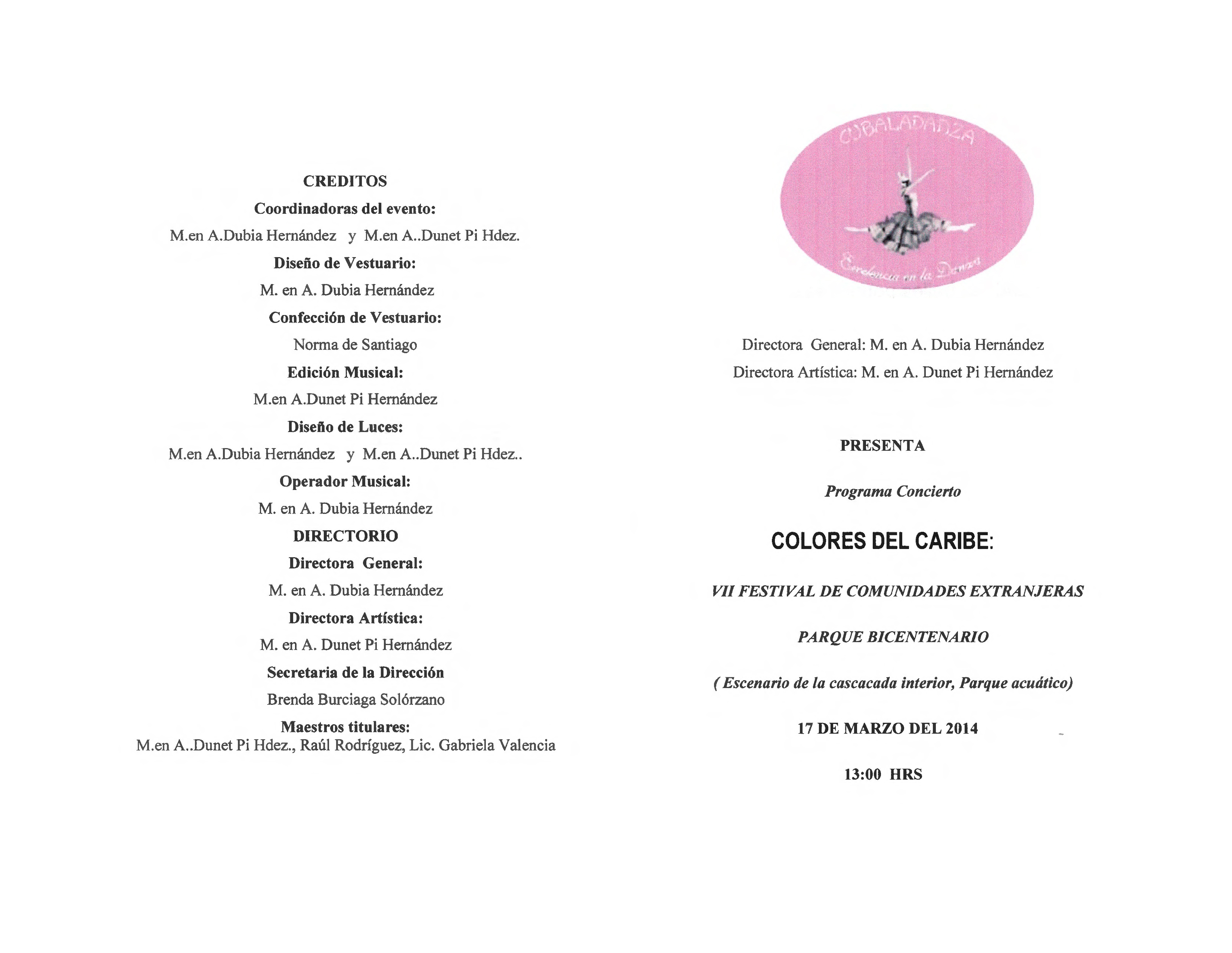 Programa por el VII Festival de Comunidades Extranjeras en el Parque Bicentenario, presentando Colores del Caribe el 17 de marzo de 2014 a las 13 hrs.