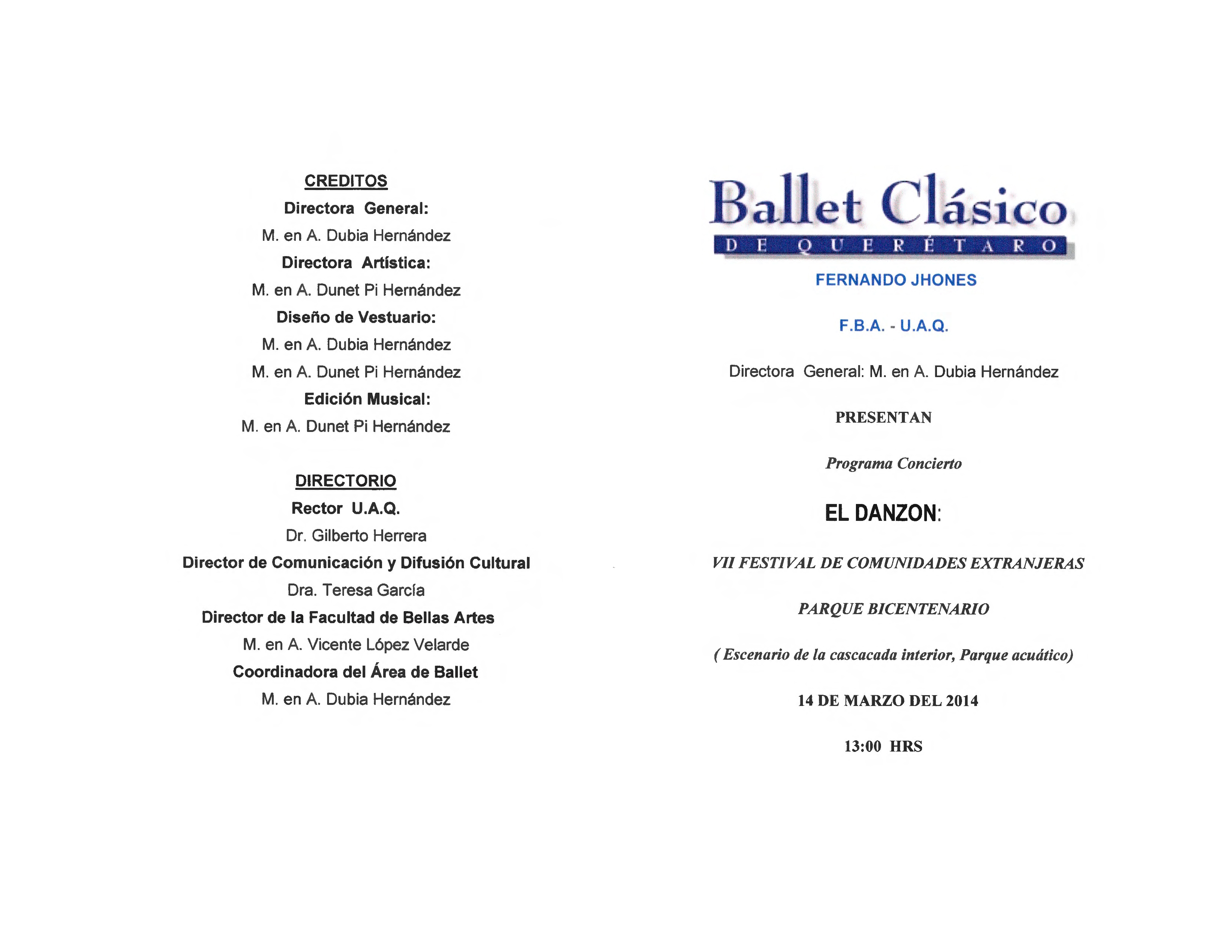 Ballet Clásico de Querétaro Fernando Jhones, “Programa Concierto El Danzón,” ReDCA-Ballet, consulta 9 de marzo de 2026, http://redca.uaq.mx/ballet/items/show/453.
