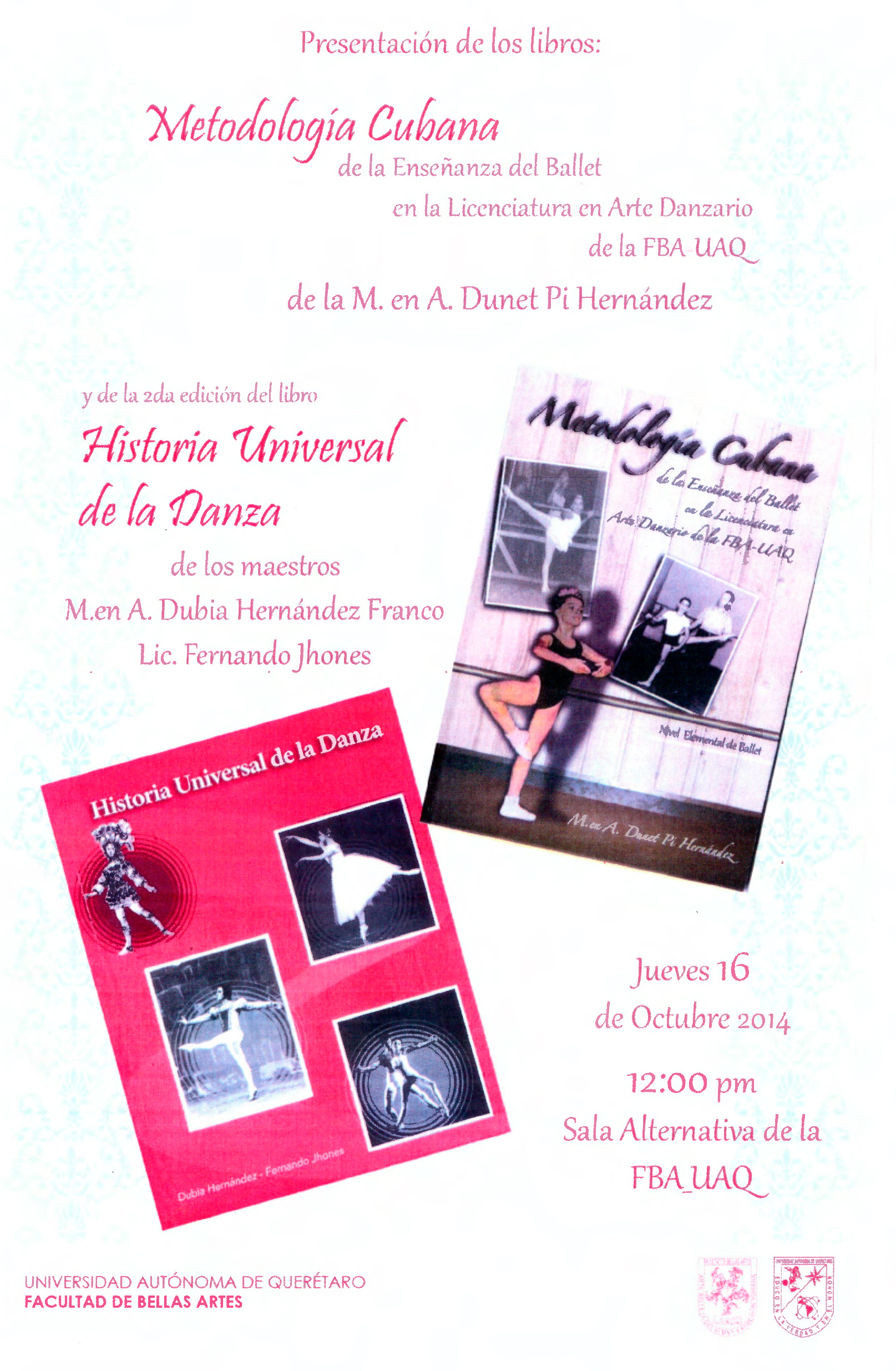Invitación para presentación de los libros: "Metodología cubana" e "Historia Universal de la Danza" el jueves 16 de octubre de 2014 a las 12 hrs en la Sala Alternativa de la FBA UAQ