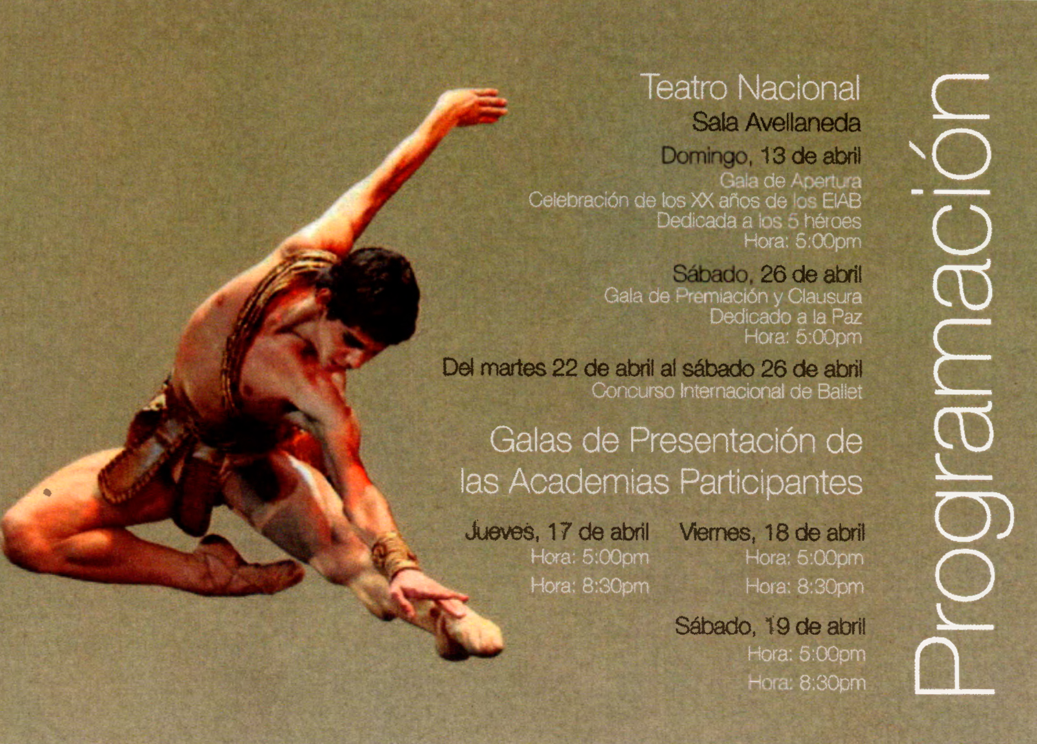 Programación del XX Encuentro Internacional de Academias para la Enseñanza del Ballet con la Gala de apertura, Celbración de los XX años delos EIAB, Dedicada a los 5 héroes, Gala de premciación y clausura, Concurso internacional de Ballet y Gala de presentación de las Academias