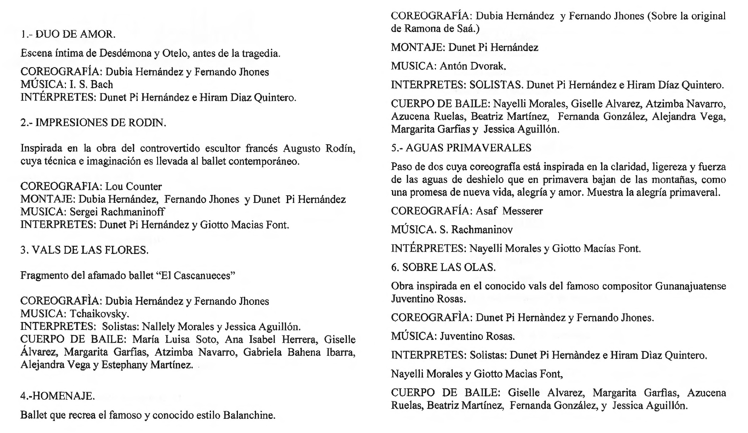 Programa realizado en San Juan del Río con las coreografías de "Dúo de amor", "Impresiones de Rodin", "Vals de las flores", "Homenaje"