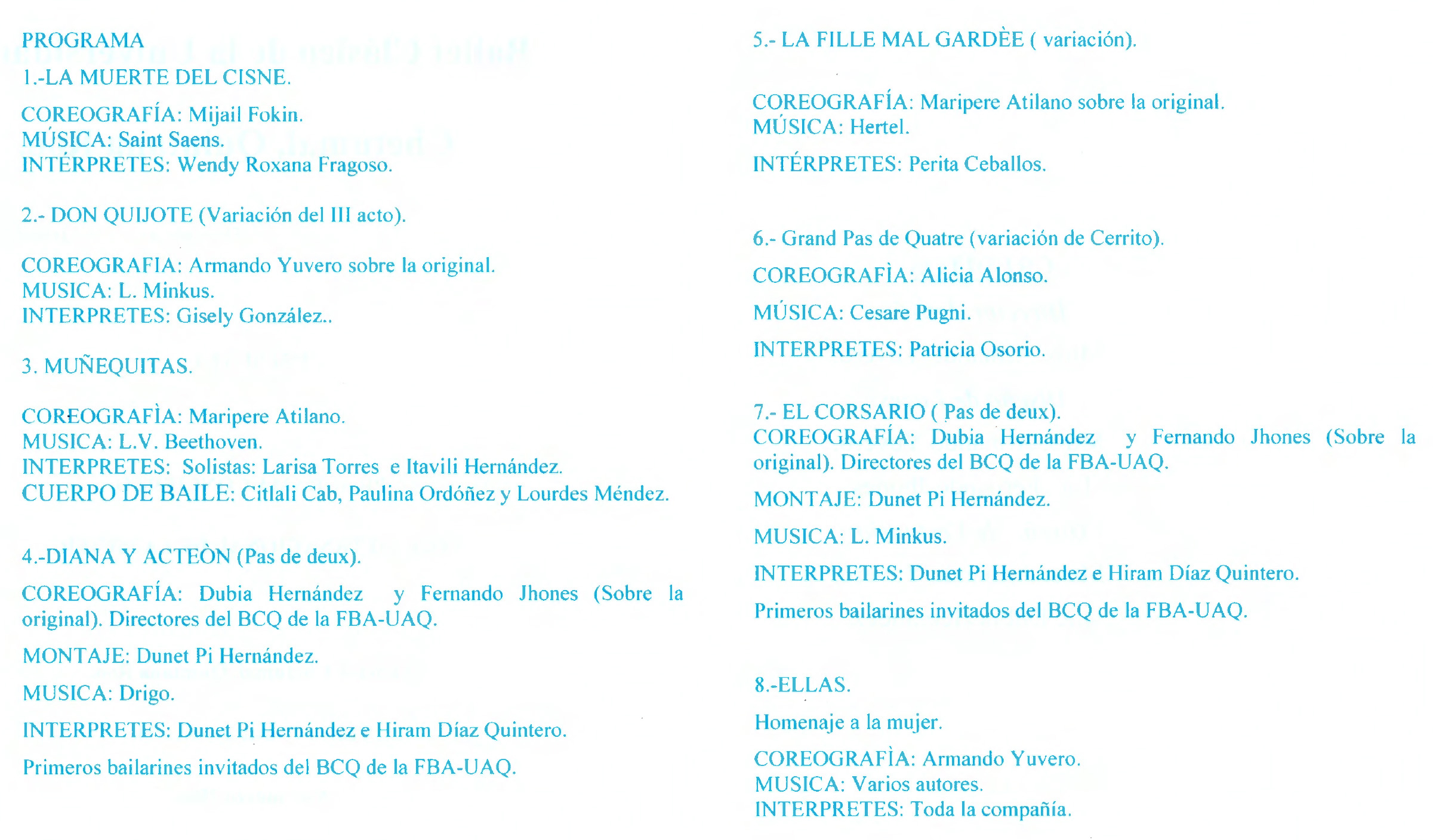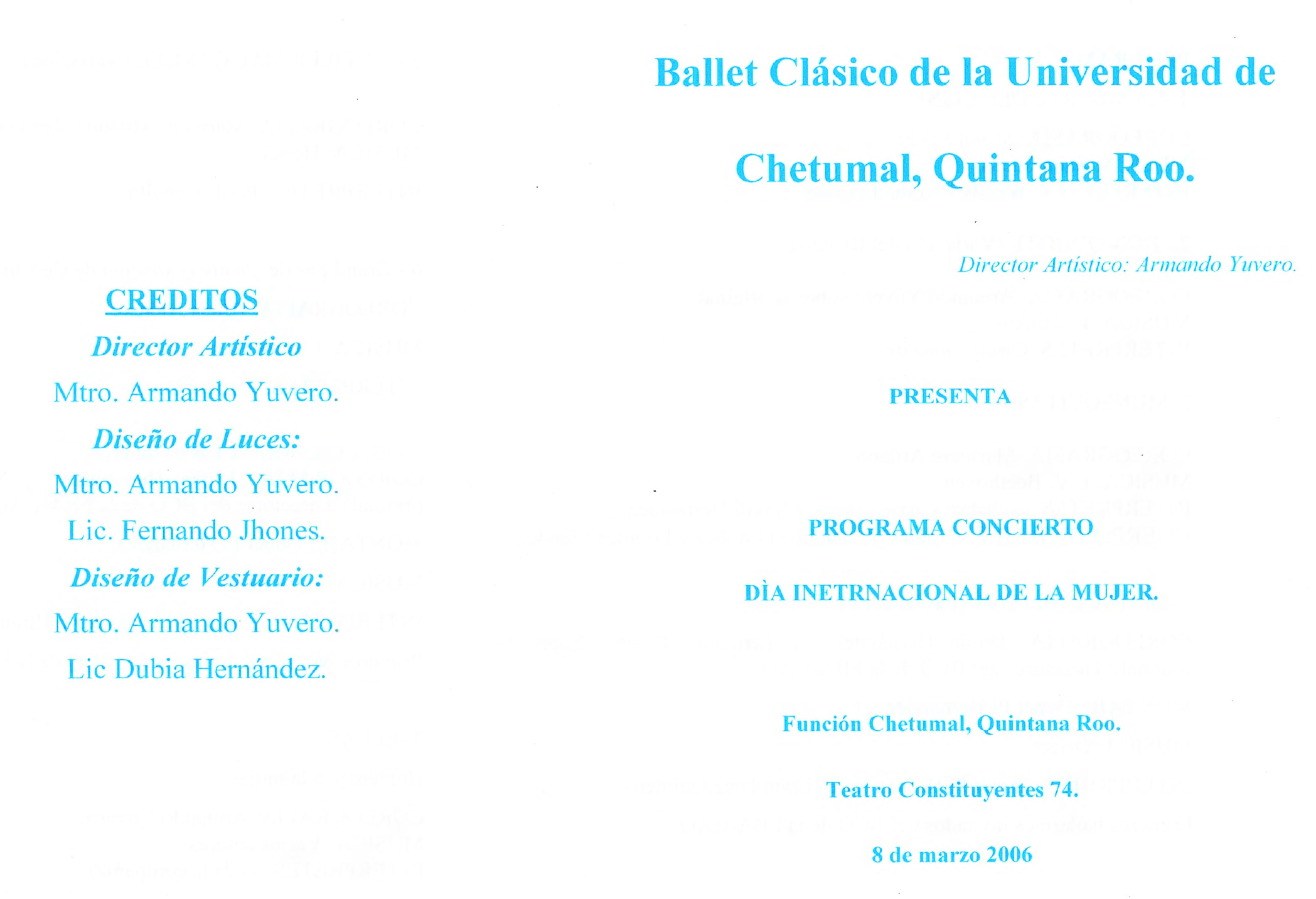 Programa compuesto por "La muerte del cisne", "Don Quijote", "Muñequitas", "Diana y Acteón" "La fille mal gardee", "Grand pas de quatre", "El corsario", "Ellas" para la función en Chetumal en el Teatro Constituyentes el día 8 de marzo de 2006
