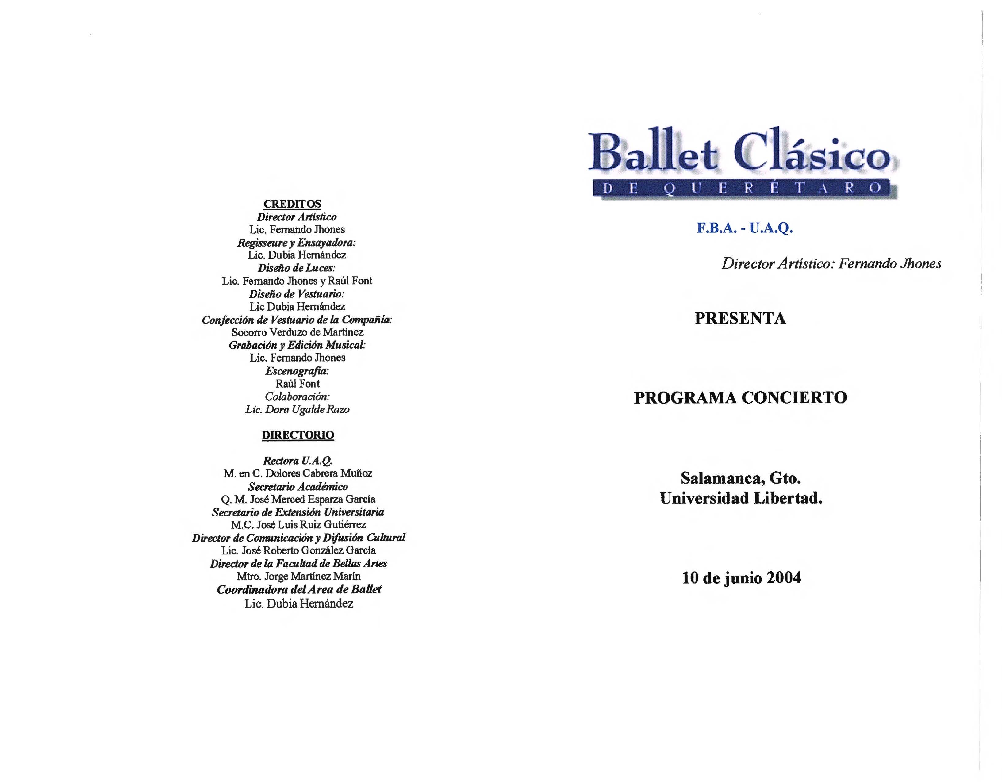 Ballet Clásico de Querétaro Fernando Jhones, “Universidad Libertad 2004 Programa Concierto,” ReDCA-Ballet, consulta 9 de marzo de 2026, http://redca.uaq.mx/ballet/items/show/468.