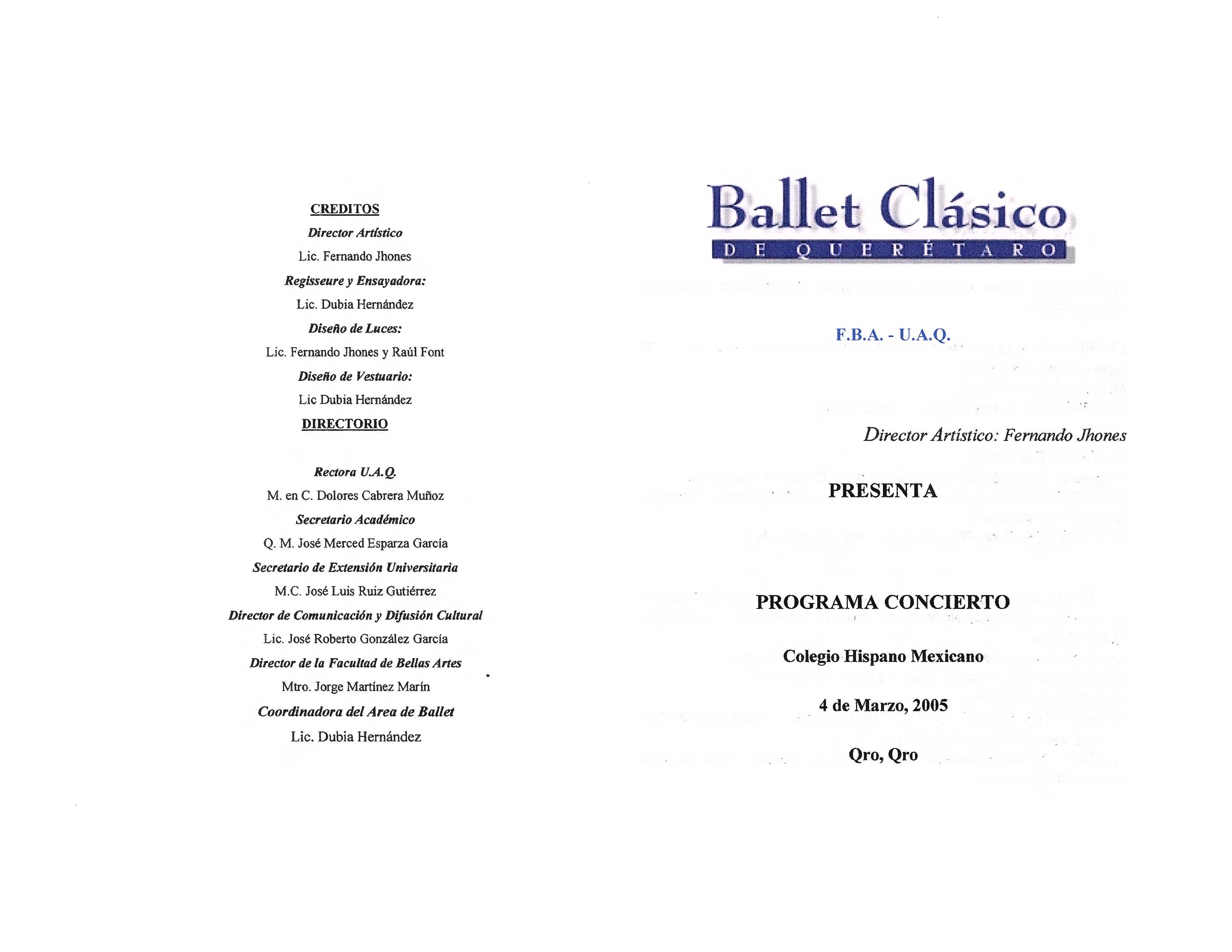 Ballet Clásico de Querétaro Fernando Jhones, “Colegio Hispano Mexicano 2005 Programa Concierto,” ReDCA-Ballet, consulta 9 de marzo de 2026, http://redca.uaq.mx/ballet/items/show/473.