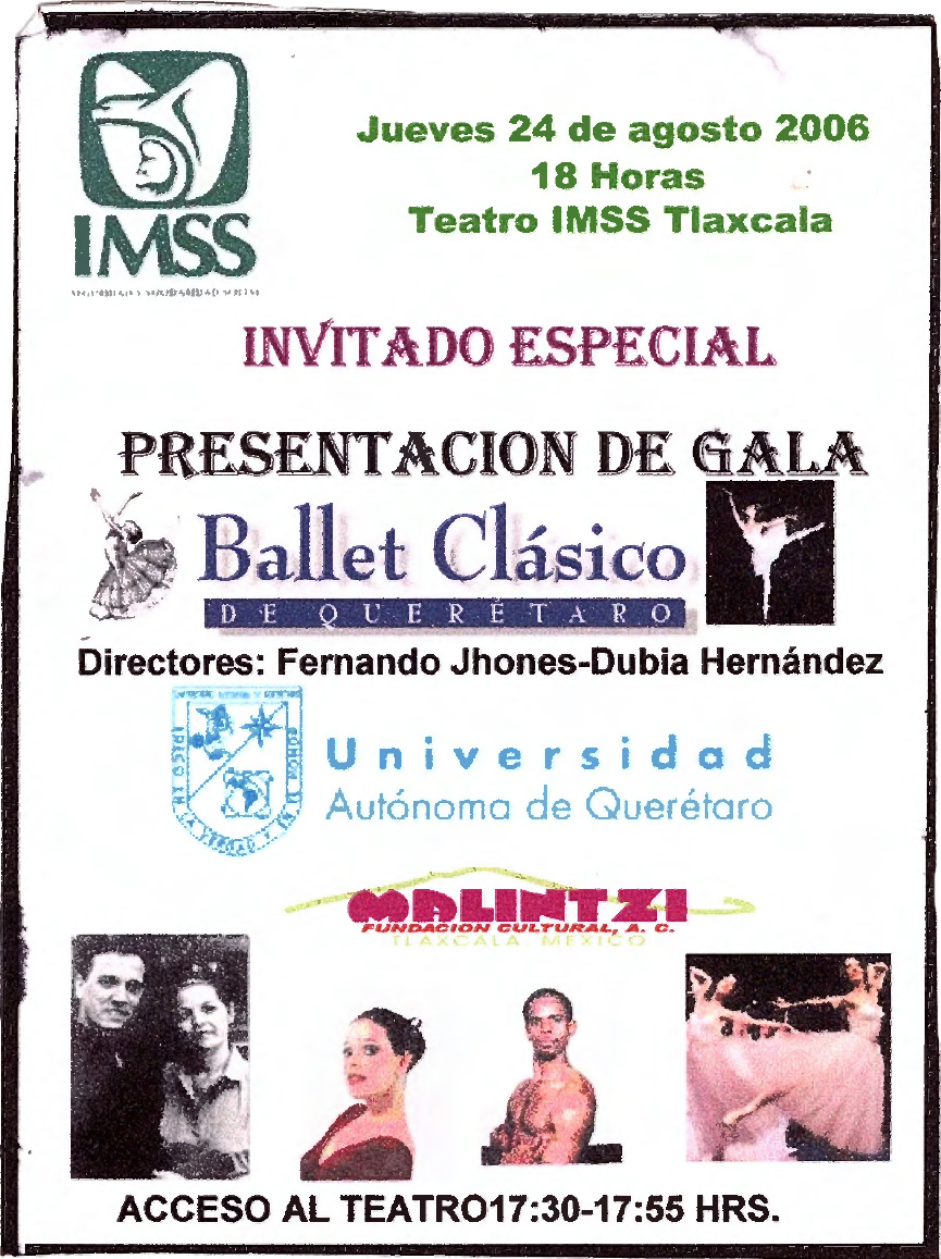 Invitación a la presentación de gala del Ballet Clásico, el jueves 24 de agosto de 2006 en el Teatro del IMSS de Tlaxcala