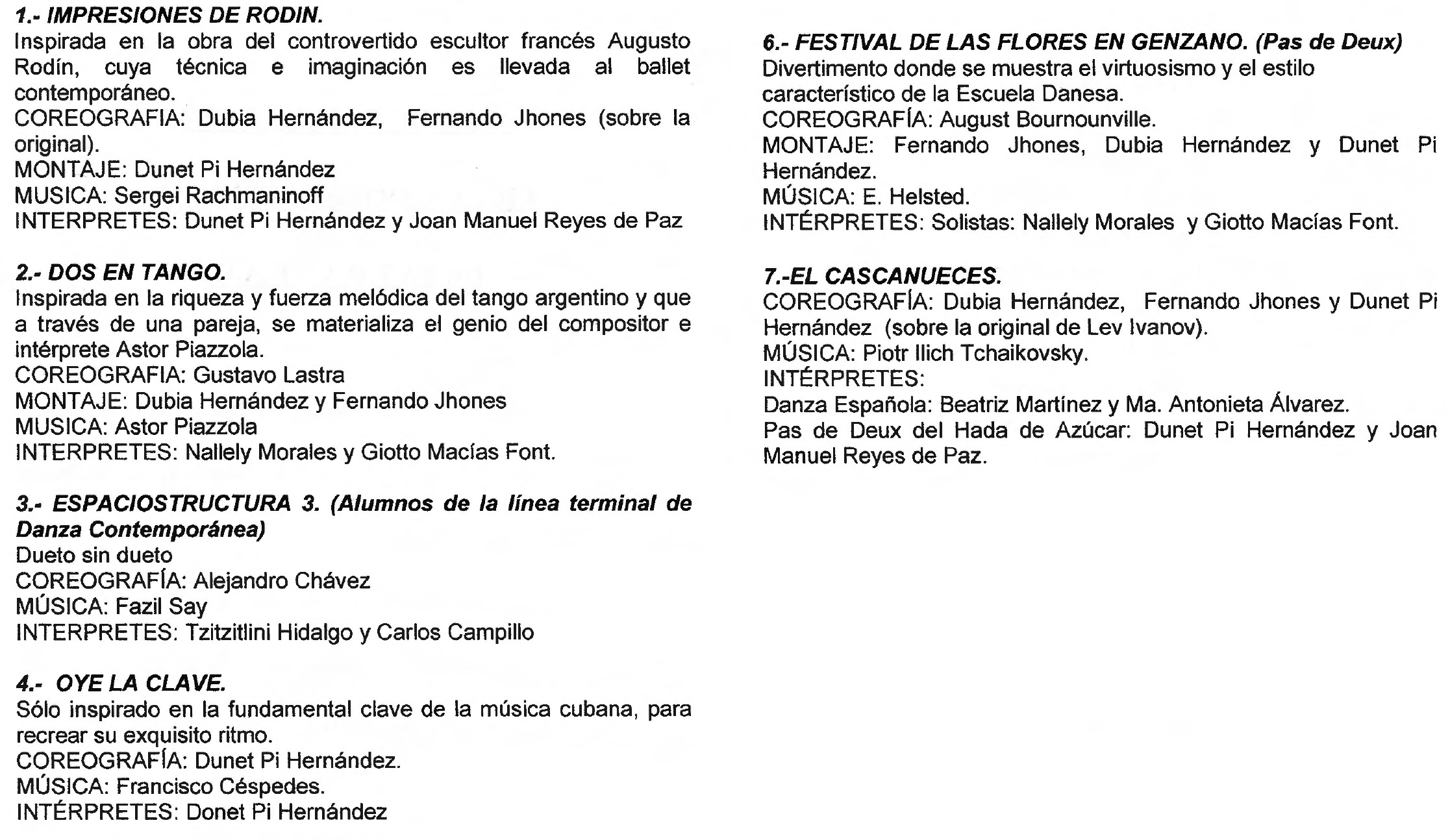 Programa de la Función en el Centro Nacional de las Artes el 7 y 8 de febrero de 2007 con: 1. Impresiones de Rodín, 2. Dos en tango, 3. Espaciostructura 3, 4. Oye la clave, 5. Festival de las Flores en Genzano, 6. El Cascanueces