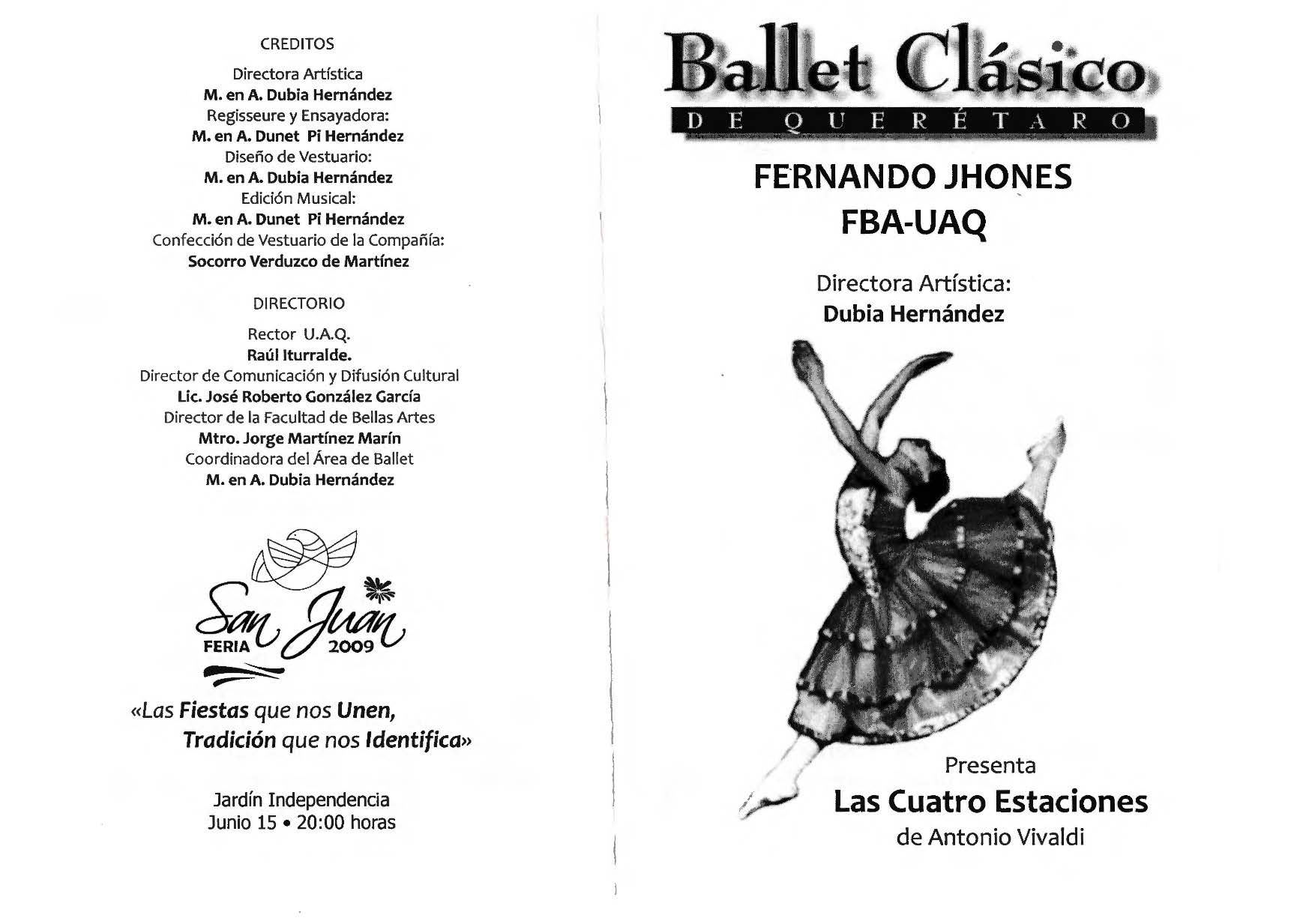 Ballet Clásico de Querétaro Fernando Jhones/Feria de San Juan/, “Feria San Juan 2009 Las Cuatro Estaciones,” ReDCA-Ballet, consulta 9 de marzo de 2026, http://redca.uaq.mx/ballet/items/show/505.