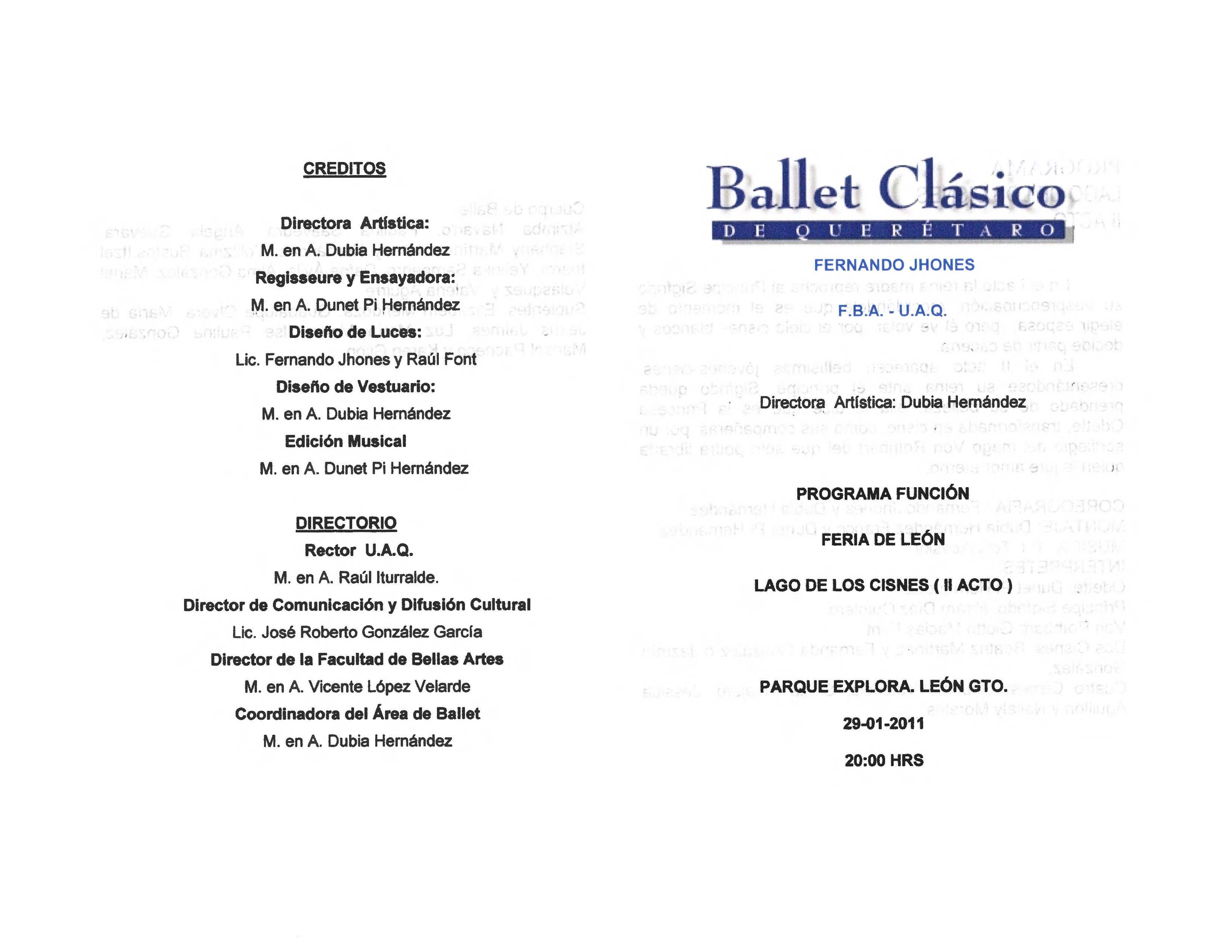 Ballet Clásico de Querétaro Fernando Jhones, “Parque Explora 2011 Lago de los Cisnes (II Acto),” ReDCA-Ballet, consulta 9 de marzo de 2026, http://redca.uaq.mx/ballet/items/show/509.