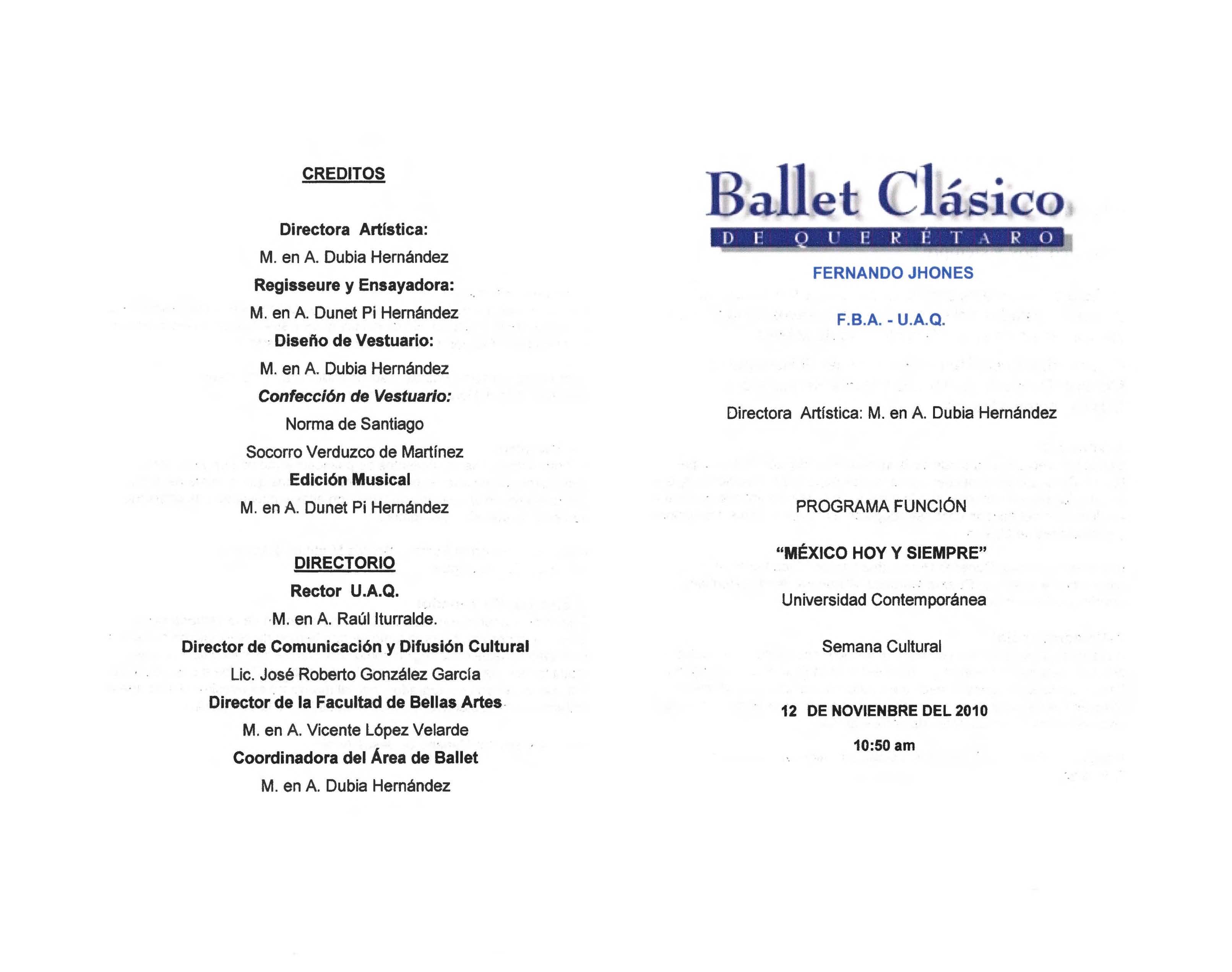 Ballet Clásico de Querétaro Fernando Jhones, “UC 2010 México Hoy y Siempre,” ReDCA-Ballet, consulta 9 de marzo de 2026, http://redca.uaq.mx/ballet/items/show/516.