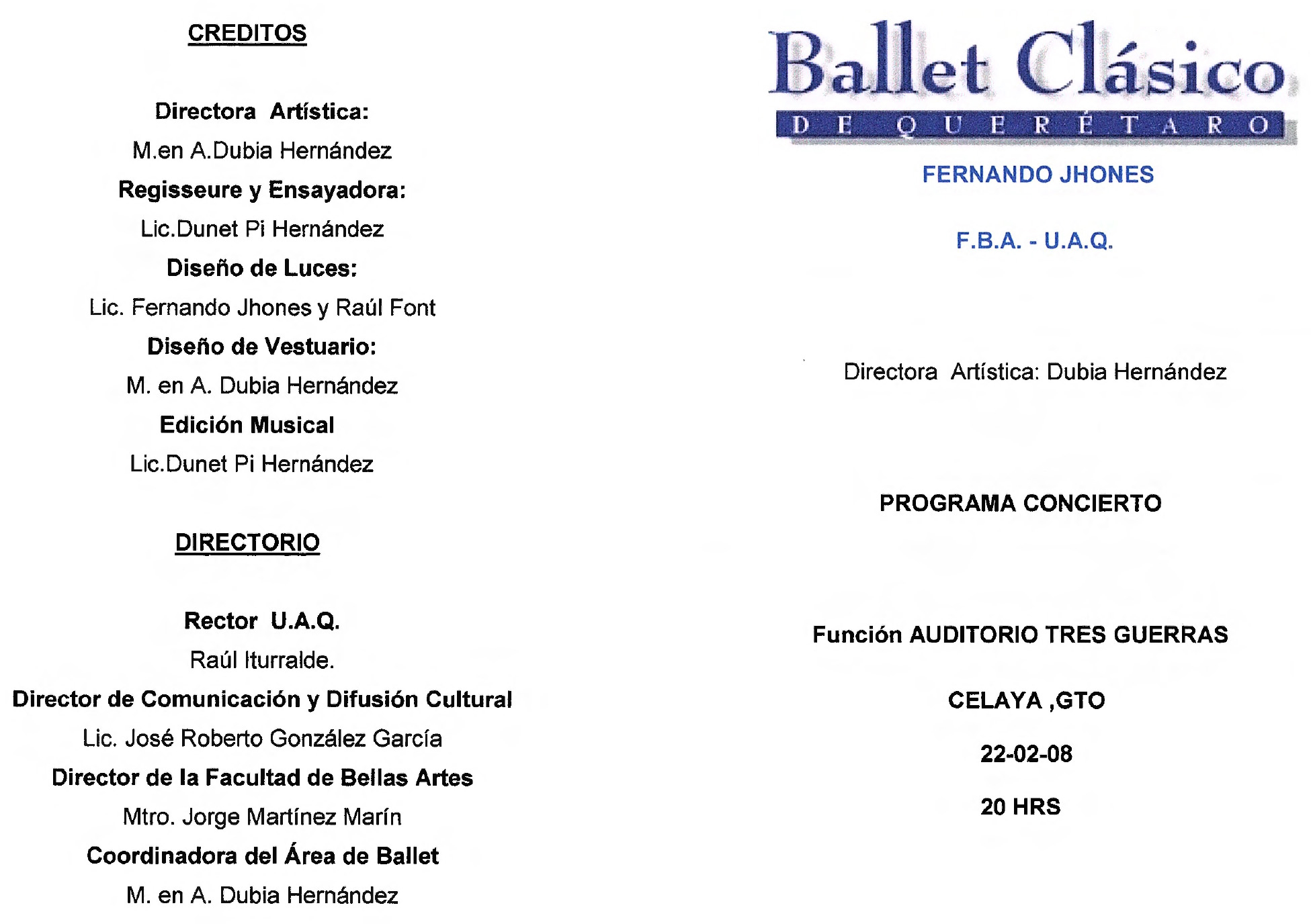 Ballet Clásico de Querétaro Fernando Jhones, “Programa Concierto Función Auditorio Tres Guerras,” ReDCA-Ballet, consulta 9 de marzo de 2026, http://redca.uaq.mx/ballet/items/show/523.