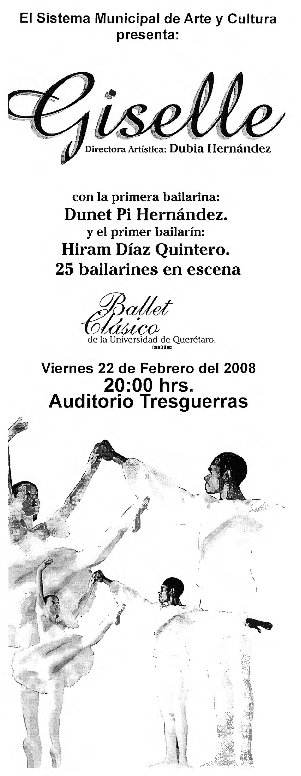 Programa de la función de Giselle, organizado por el Sistema Municipal de Arte y Cultura, el viernes 22 de febrero del 2008, a las 20 hrs, en el auditorio Tres Guerras