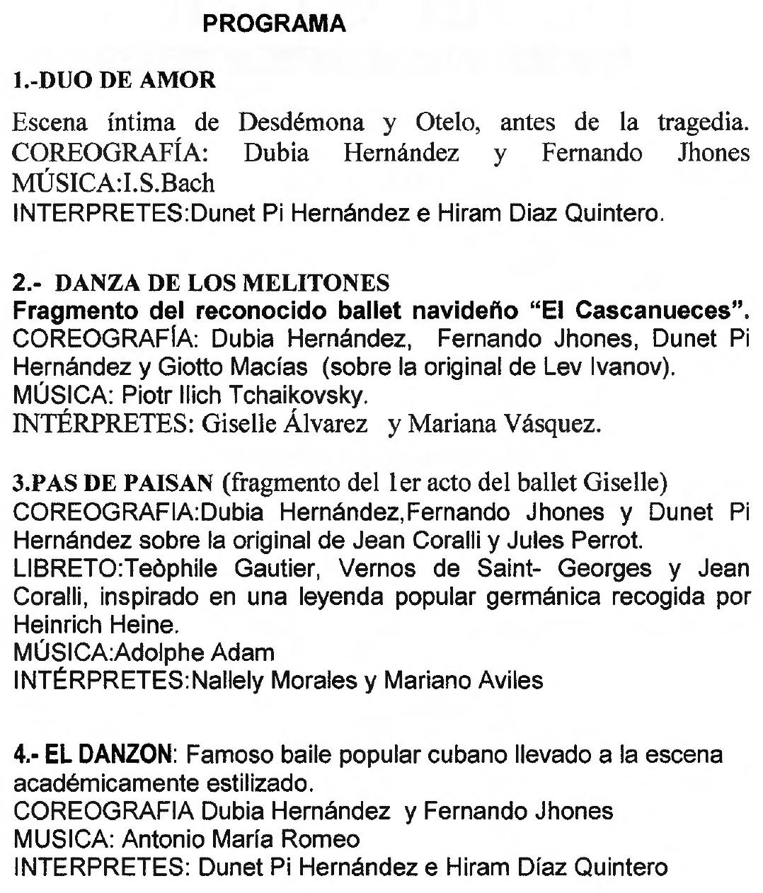1.Dúo de amor, 2.Danza de los melitones, 3.Pas de paisan, 4.El Danzón