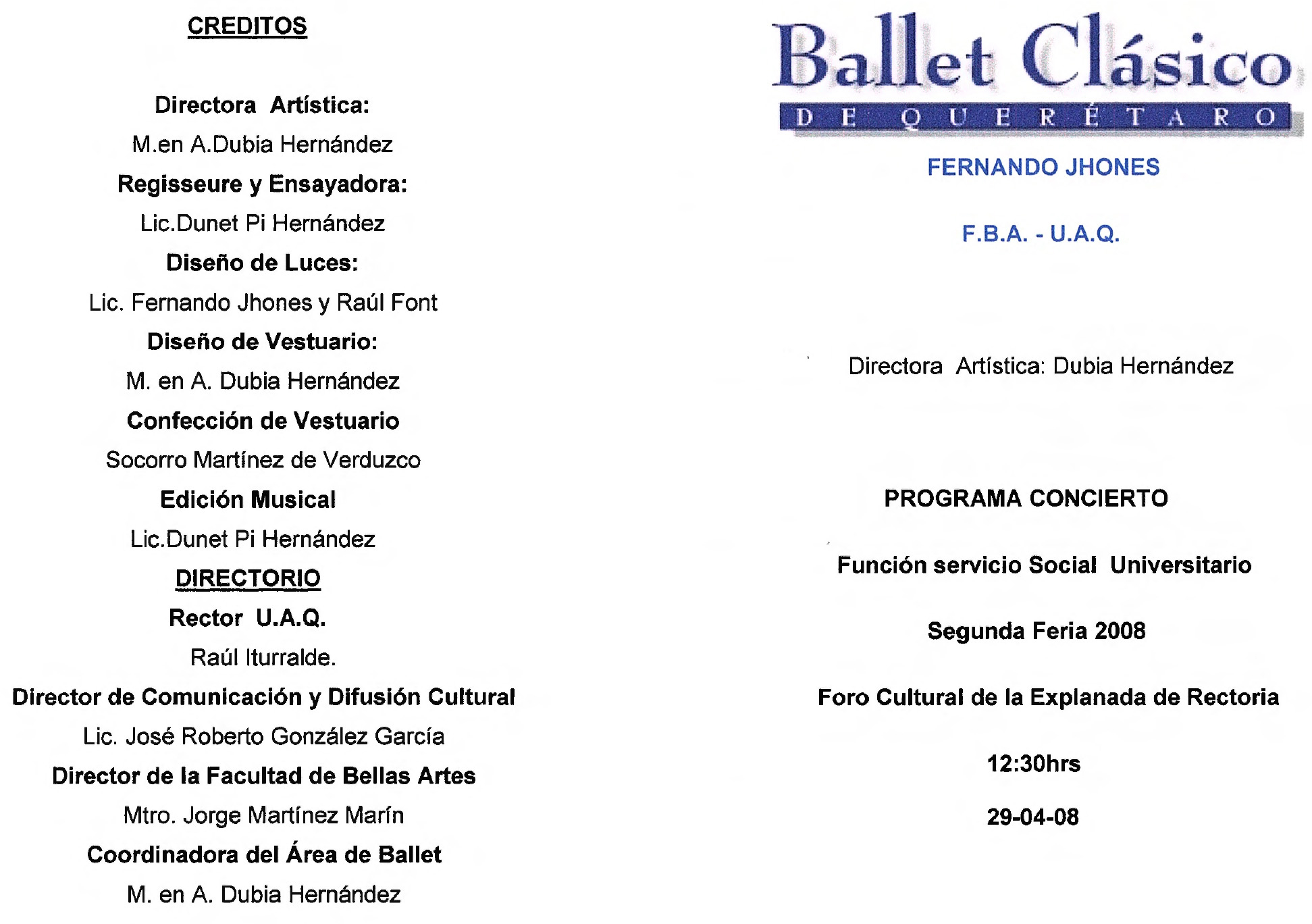 Ballet Clásico de Querétaro Fernando Jhones, “Programa concierto Función Servicio Social Universitario,” ReDCA-Ballet, consulta 9 de marzo de 2026, http://redca.uaq.mx/ballet/items/show/526.