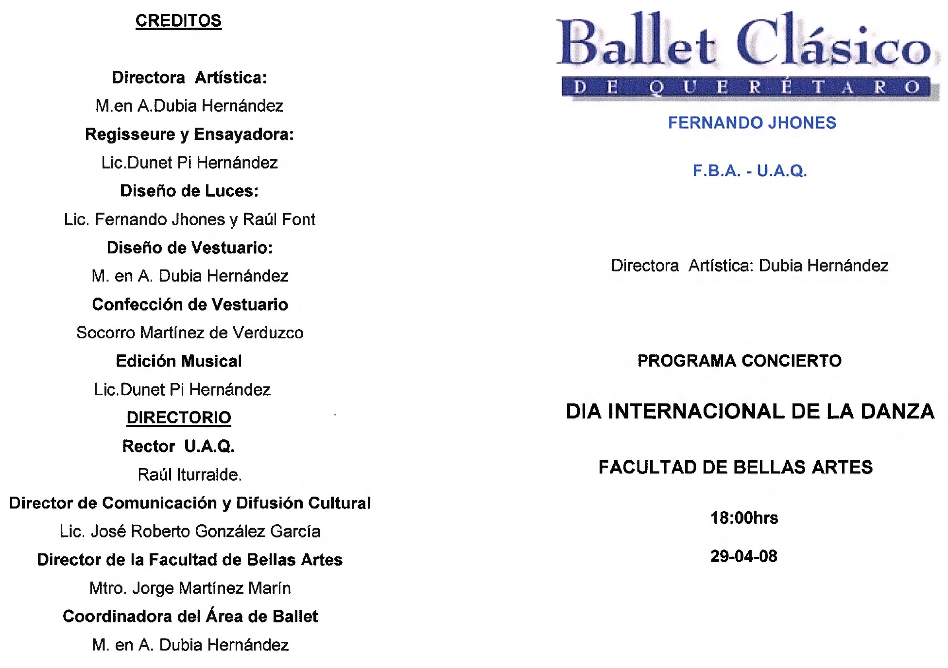 Programa por el Día Internacional de la Danza en la FBA de la UAQ a las 18 hrs el día 29 de abril de 2008. Directora artística: Dubia Hernández
