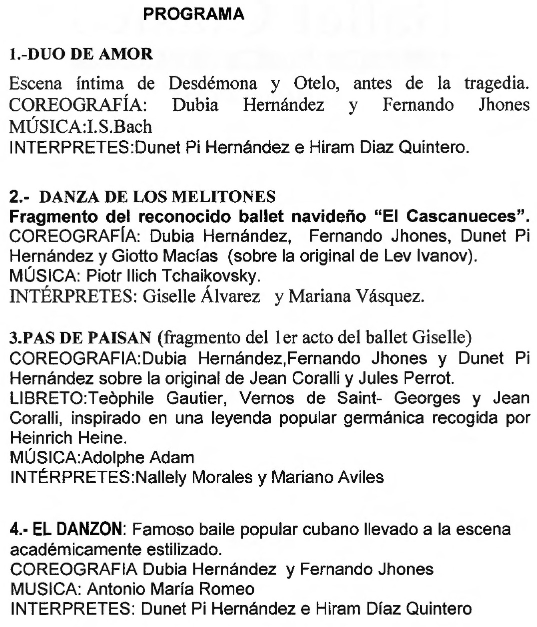 1.Dúo de amor, 2.Danza de los melitones, 3.Pas de paisan, 4.El Danzón