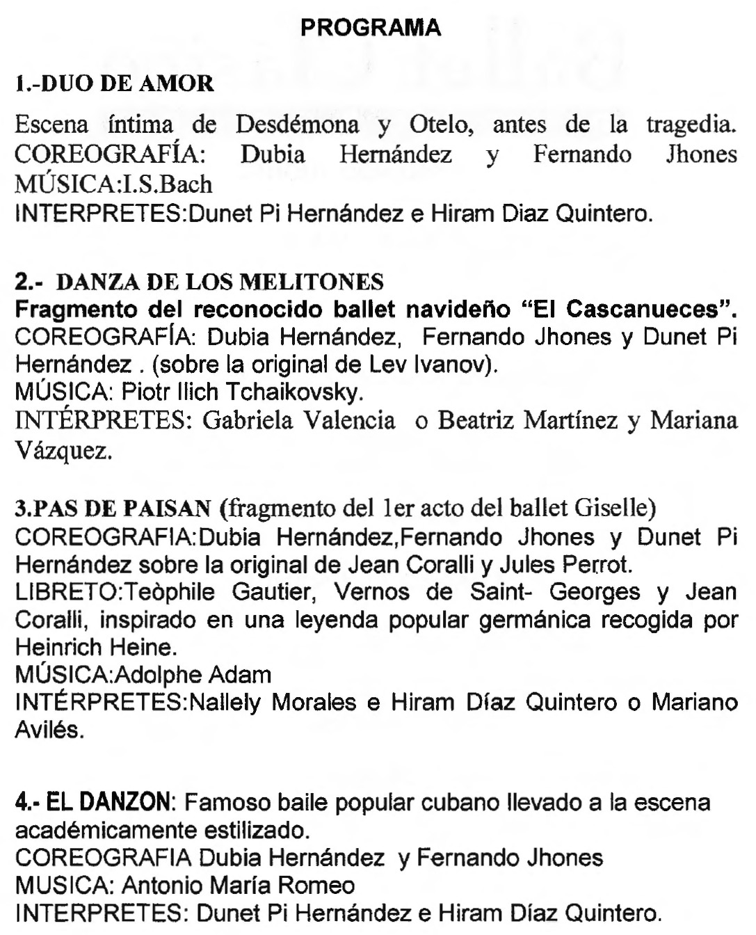 Programa compuesto por 1.Dúo de amor, 2.Danza de los melitones, 3.Pas de paisan, 4.El Danzón