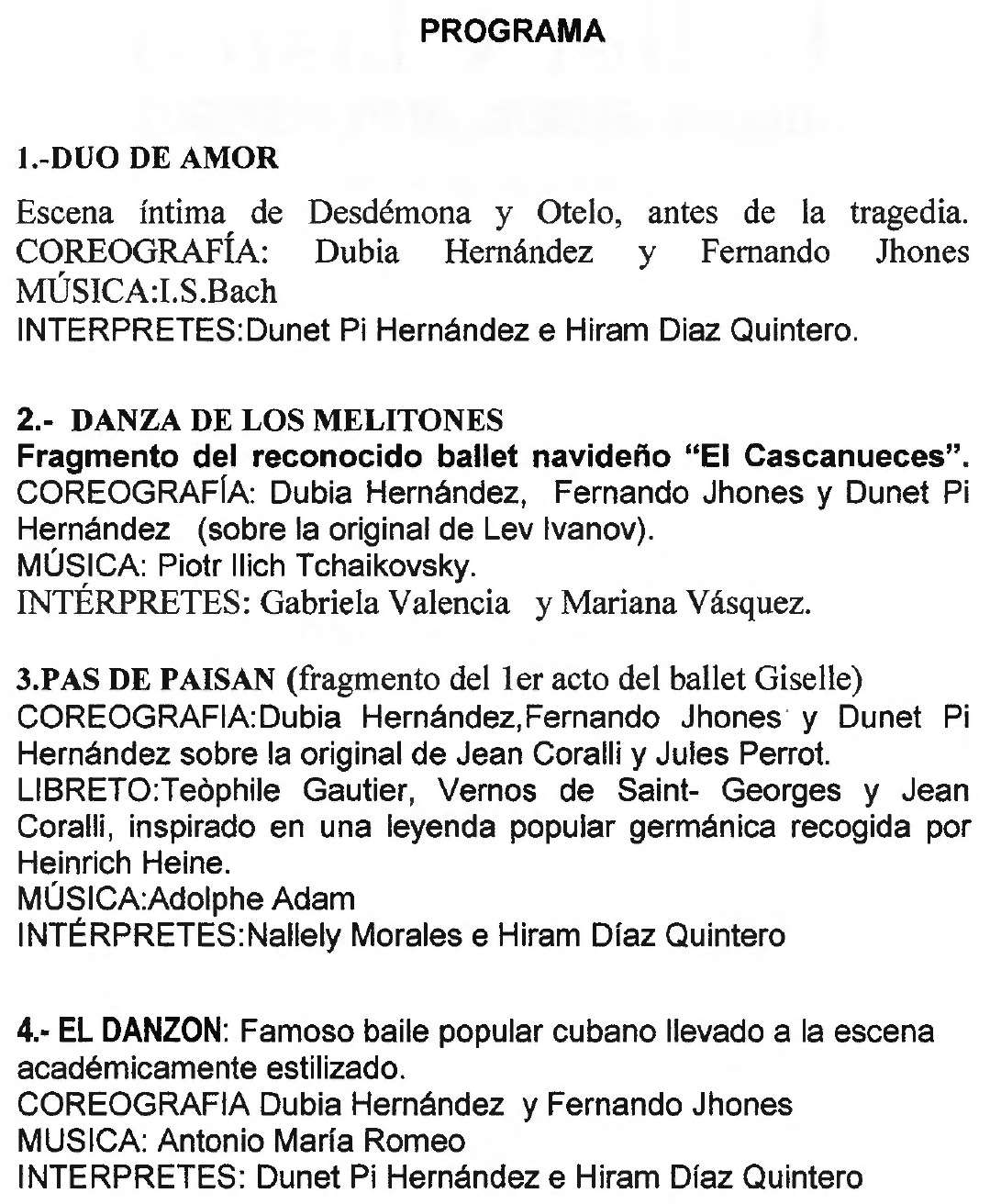 Programa compuesto por 1.Dúo de amor, 2.Danza de los melitones, 3.Pas de paisan, 4.El Danzón