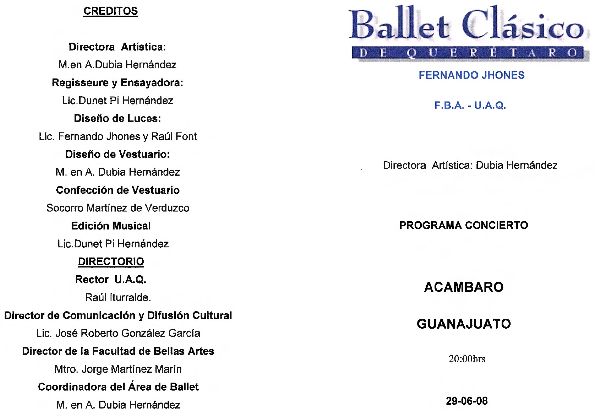 Ballet Clásico de Querétaro Fernando Jhones, “Programa concierto Acámbaro, Guanajuato,” ReDCA-Ballet, consulta 9 de marzo de 2026, http://redca.uaq.mx/ballet/items/show/537.