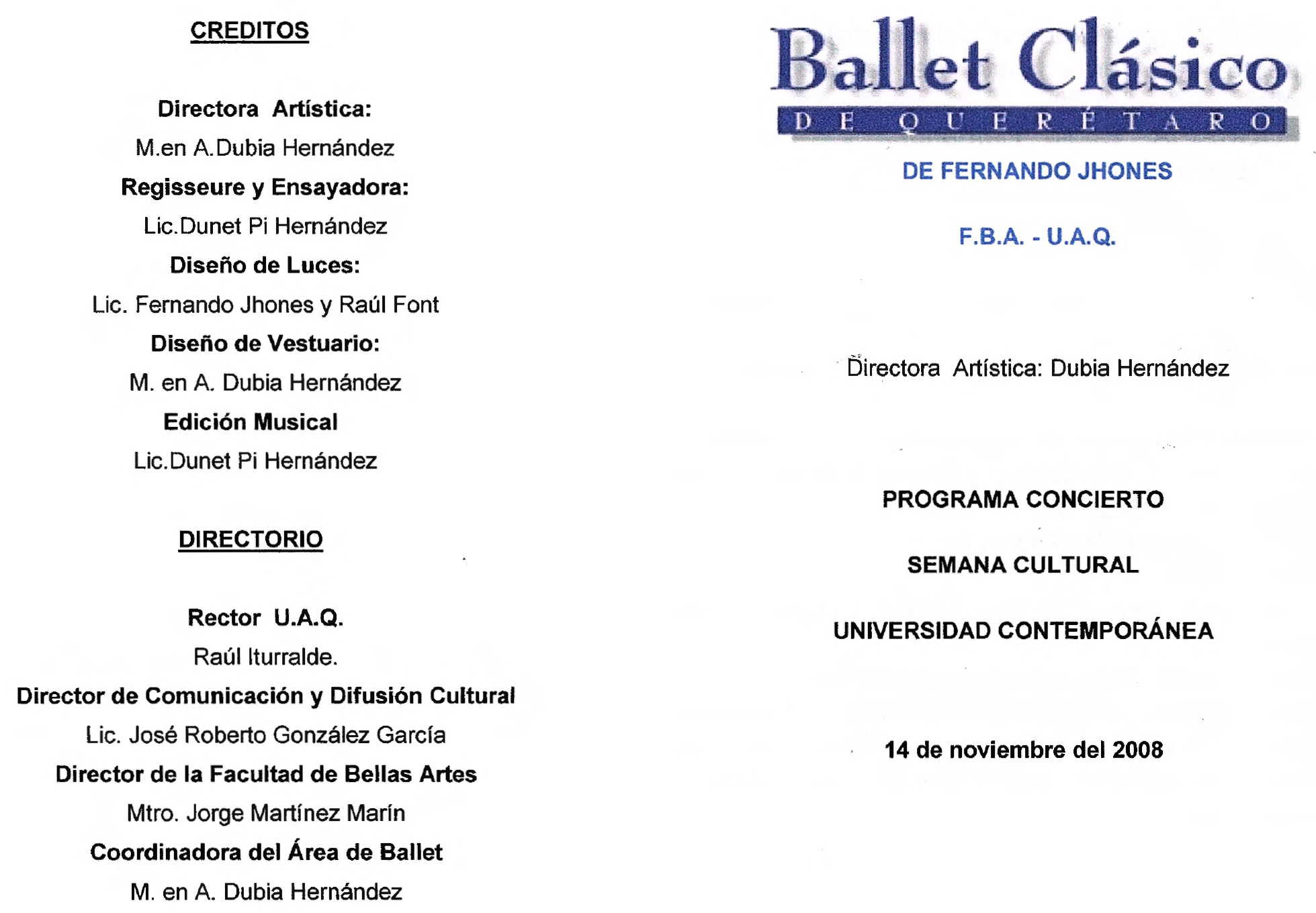 Ballet Clásico de Querétaro Fernando Jhones, “Programa concierto Semana Cultural Universidad Contemporánea 2008,” ReDCA-Ballet, consulta 9 de marzo de 2026, http://redca.uaq.mx/ballet/items/show/540.