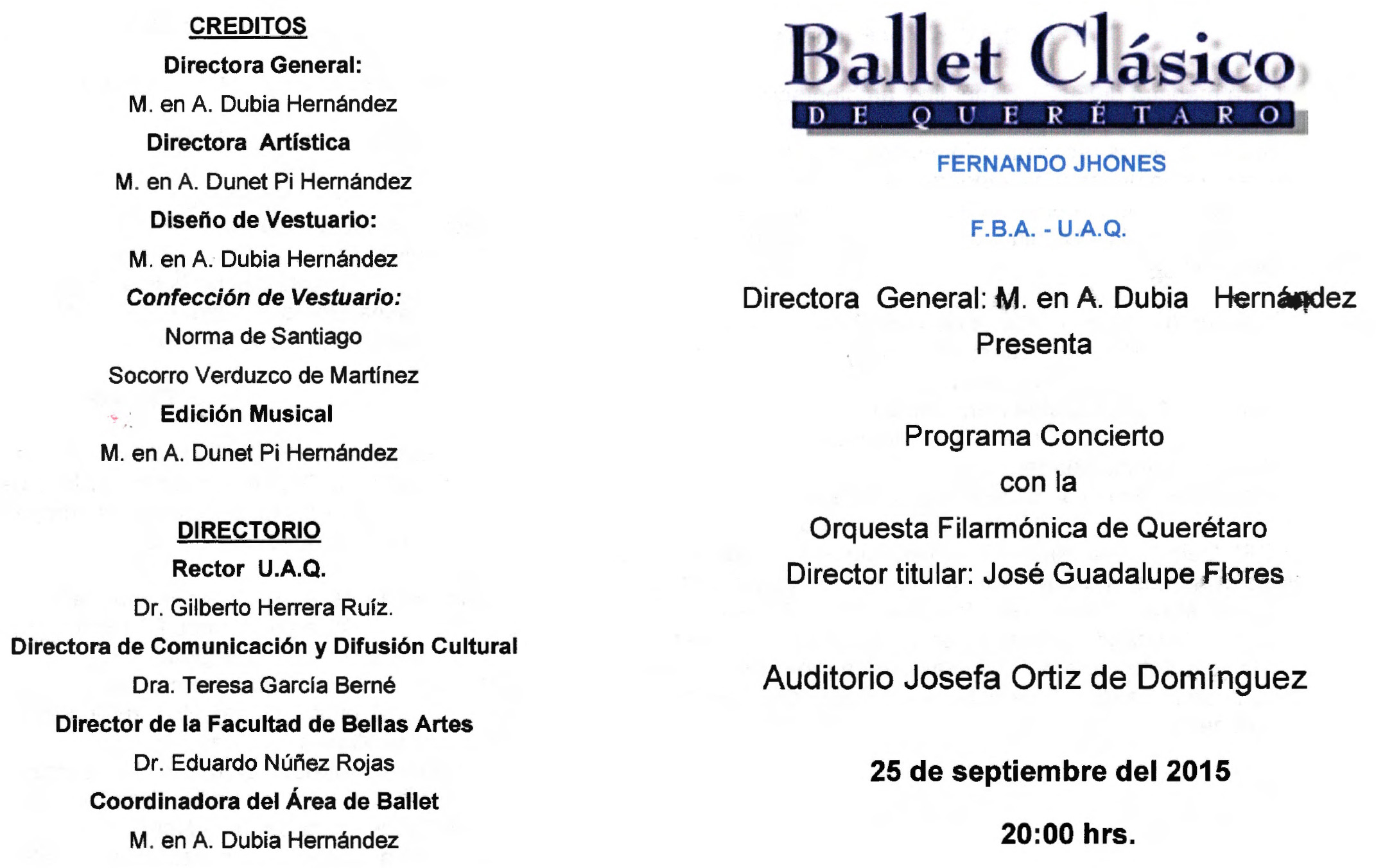 Ballet Clásico de Querétaro Fernando Jhones, “Programa concierto con la OFEQ 2015,” ReDCA-Ballet, consulta 9 de marzo de 2026, http://redca.uaq.mx/ballet/items/show/547.