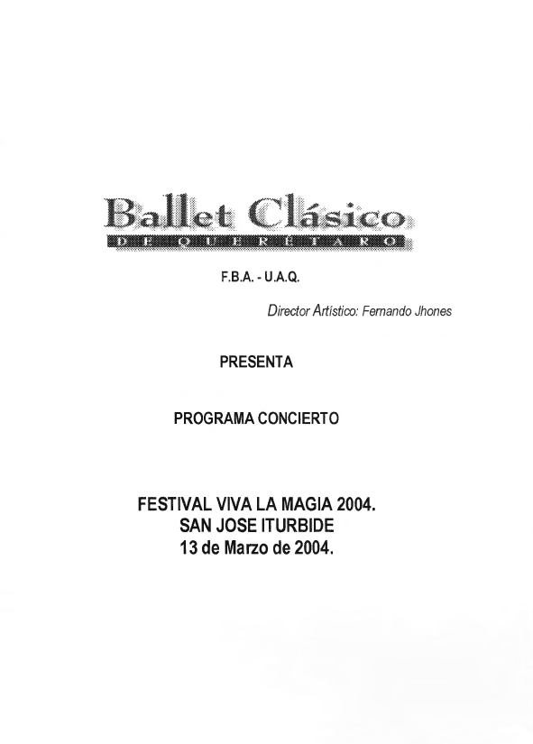 Ballet Clásico de Querétaro Fernando Jhones, “Programa Concierto Festival Viva la Magia 2004 San José Iturbide,” ReDCA-Ballet, consulta 9 de marzo de 2026, http://redca.uaq.mx/ballet/items/show/548.