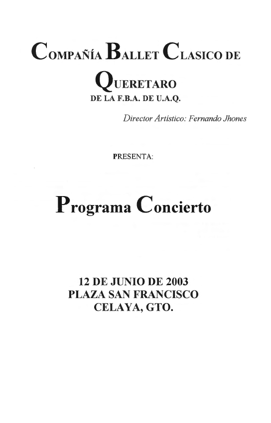 Ballet Clásico de Querétaro Fernando Jhones, “Programa Concierto San Francisco,” ReDCA-Ballet, consulta 9 de marzo de 2026, http://redca.uaq.mx/ballet/items/show/550.