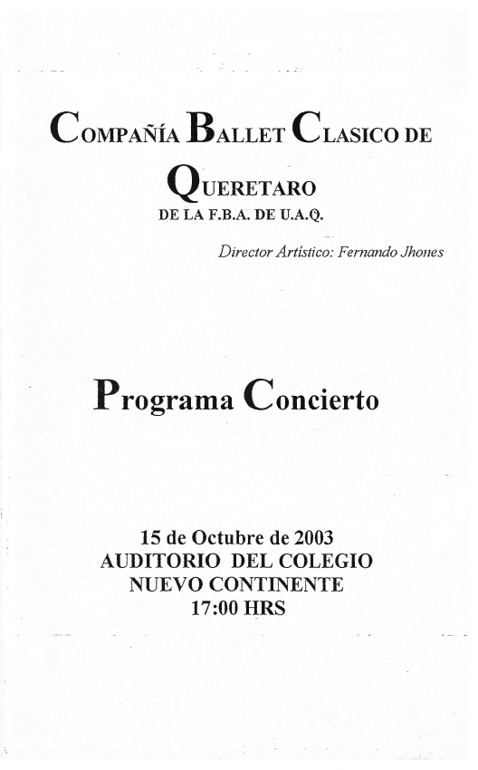 Ballet Clásico de Querétaro Fernando Jhones, “Programa Concierto Auditorio del Colegio Nuevo Contienente,” ReDCA-Ballet, consulta 9 de marzo de 2026, http://redca.uaq.mx/ballet/items/show/556.