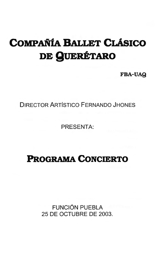 Ballet Clásico de Querétaro Fernando Jhones, “Programa Concierto Función Puebla,” ReDCA-Ballet, consulta 9 de marzo de 2026, http://redca.uaq.mx/ballet/items/show/557.