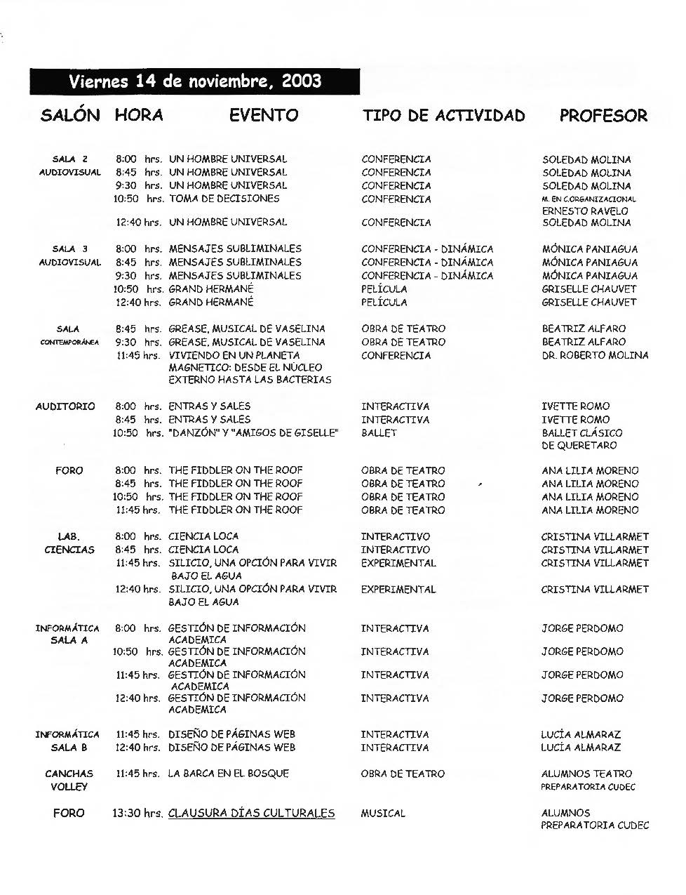 Programa de actividades y eventos para los días culturales de la Universidad Contemporánea, Preparatoria CUDEC.