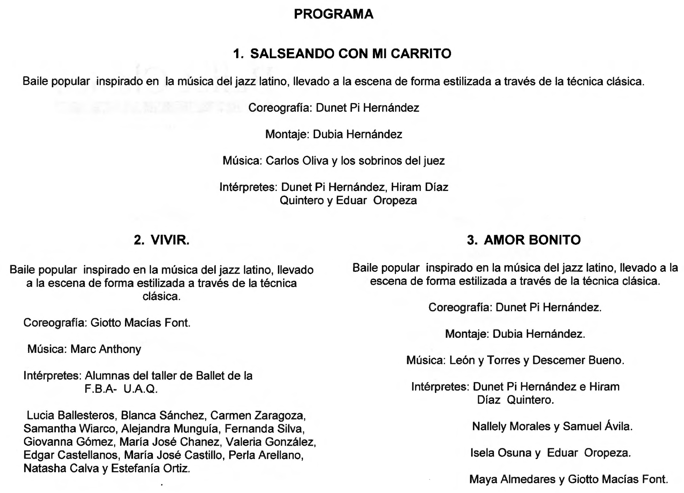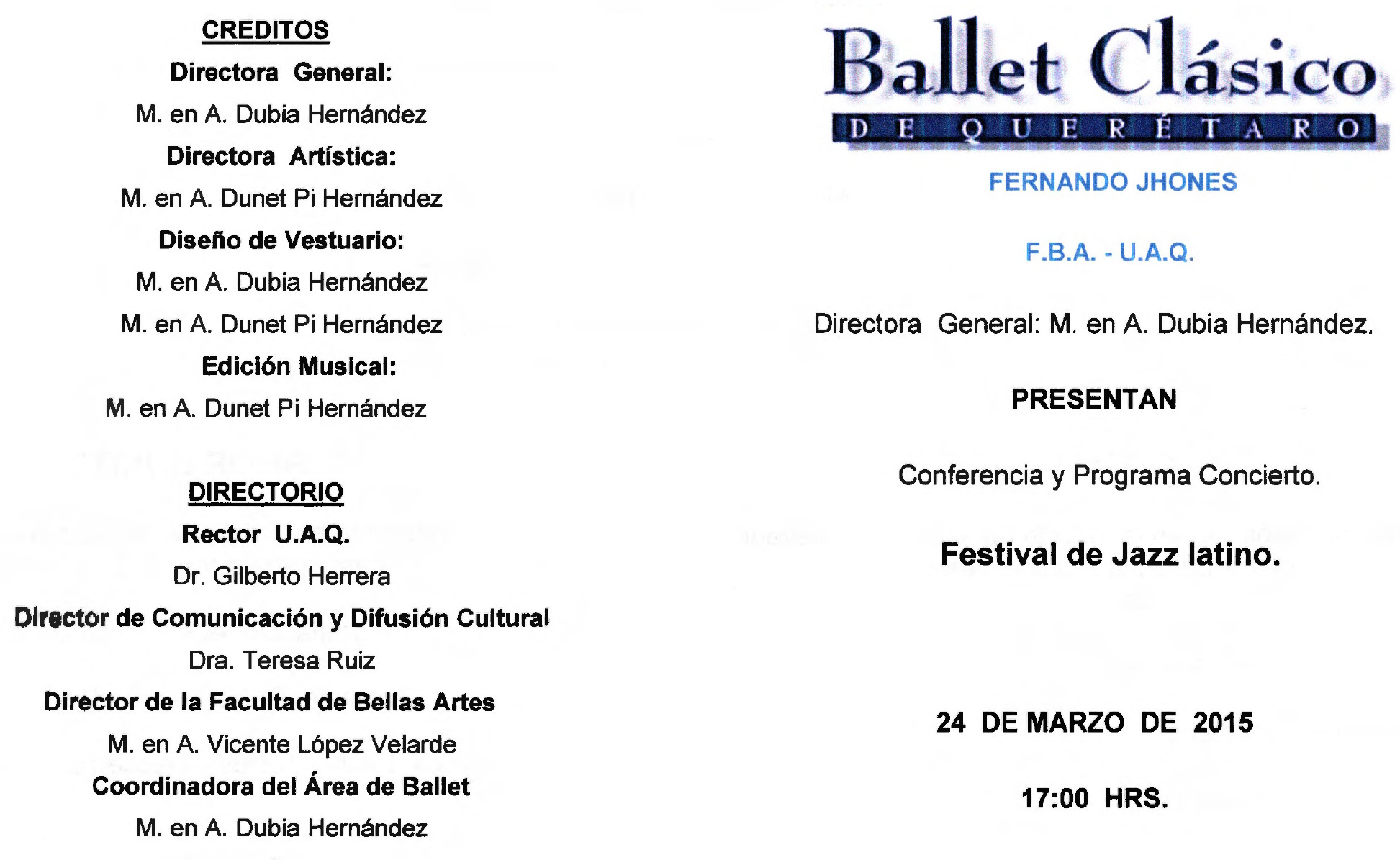 Ballet Clásico de Querétaro Fernando Jhones, “Conferencia y programa concierto Festival de Jazz latino,” ReDCA-Ballet, consulta 9 de marzo de 2026, http://redca.uaq.mx/ballet/items/show/564.