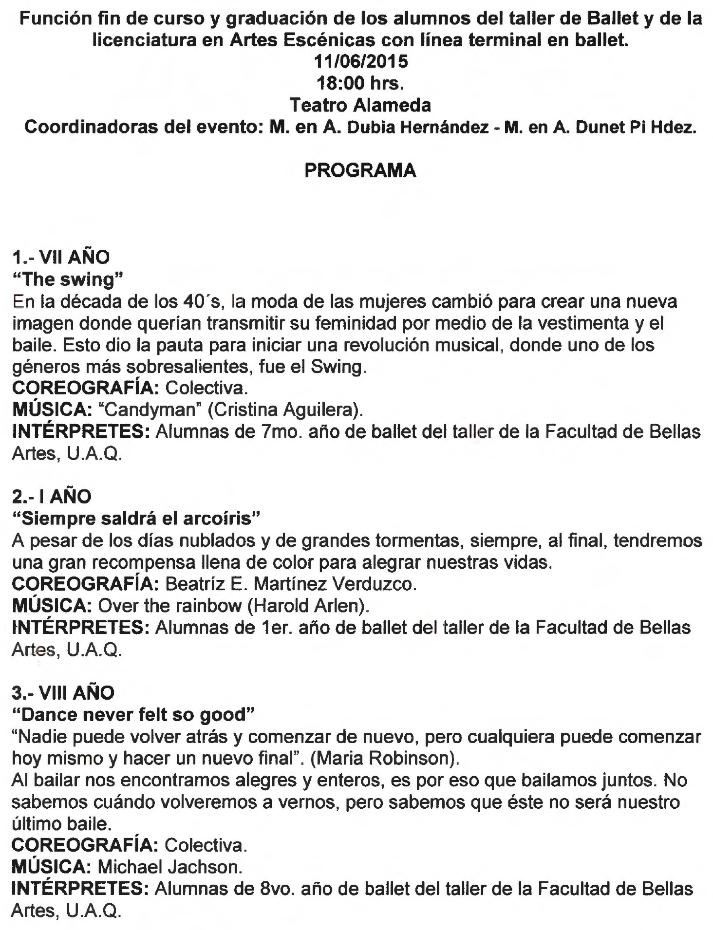 Programa de la graduación de los alumnos del taller de Ballet y de la licenciatura en Artes Escénicas con línea terminal en ballet, el 11 de junio de 2015 a ñas 18 hrs. en el teatro Alameda