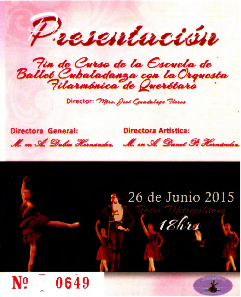 Boleto para la presentación de Fin de curso de la Escuela de Ballet Cubaladanza con la OFEQ, el 26 de junio de 2015 a las 18 hrs en el teatro Metropolitano