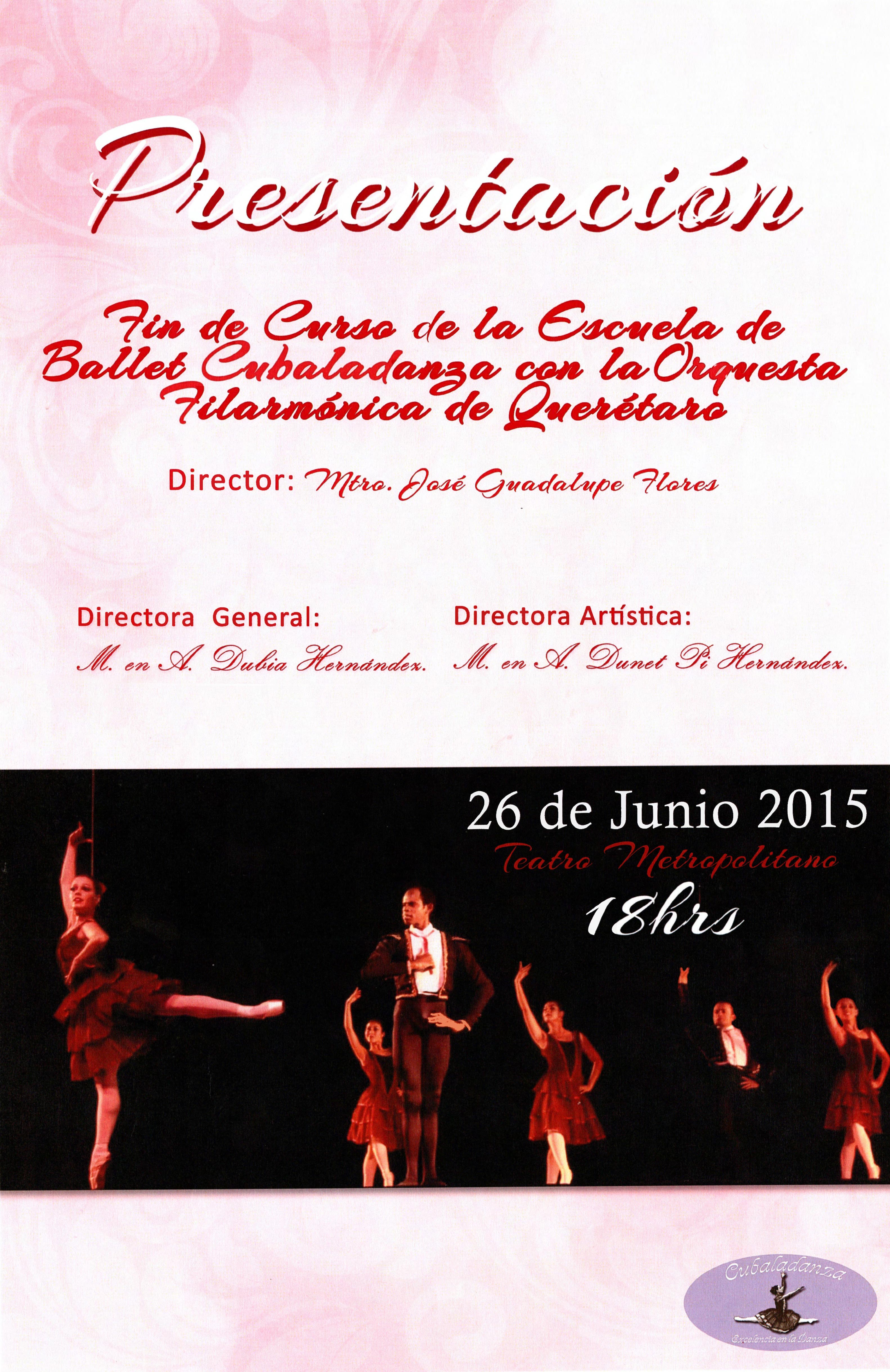 Cartel para la presentación de Fin de curso de la Escuela de Ballet Cubaladanza con la OFEQ, el 26 de junio de 2015 a las 18 hrs en el teatro Metropolitano