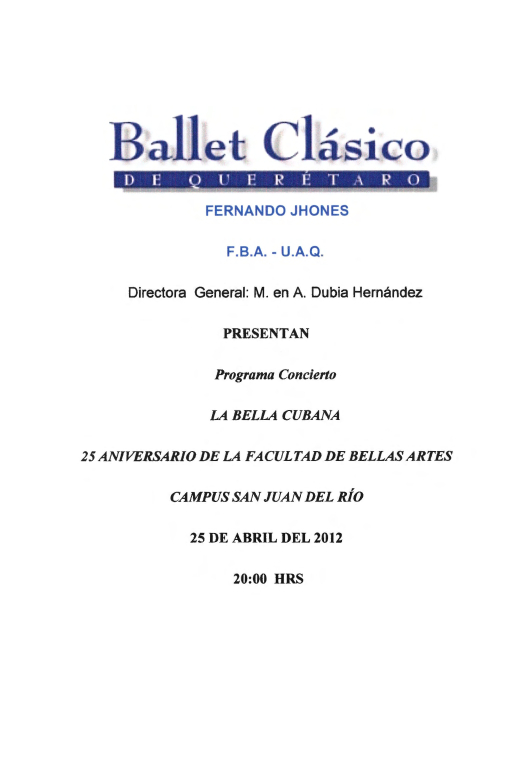 Ballet Clásico de Querétaro Fernando Jhones, “La Bella Cubana. 25 Aniversario de la FBA Campus San Juan del Río,” ReDCA-Ballet, consulta 9 de marzo de 2026, http://redca.uaq.mx/ballet/items/show/572.