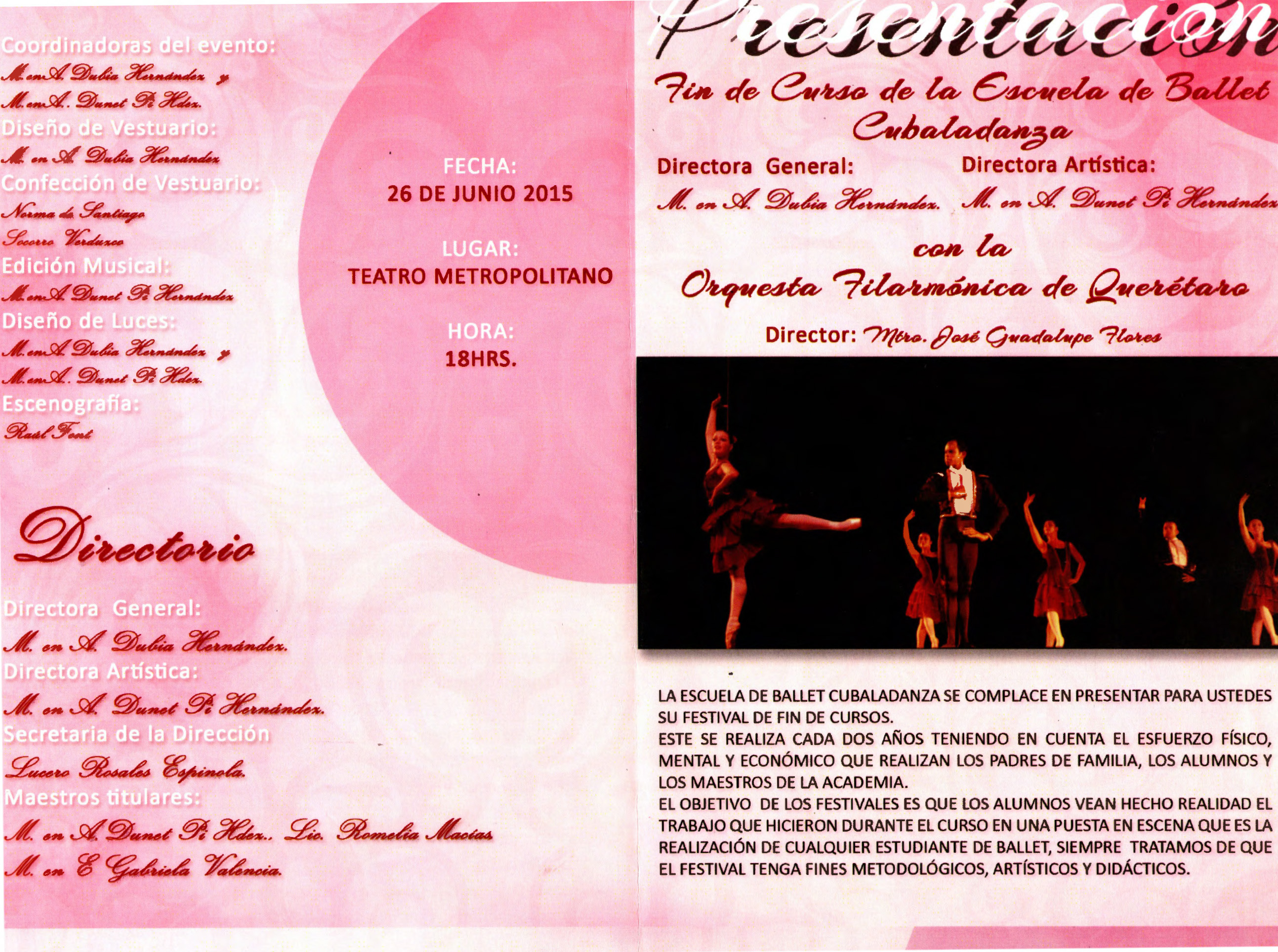 Programa para la presentación de Fin de curso de la Escuela de Ballet Cubaladanza con la OFEQ, el 26 de junio de 2015 a las 18 hrs en el teatro Metropolitano. Se describe el por qué se realiza la presentación