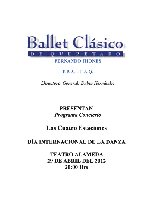 Ballet Clásico de Querétaro Fernando Jhones, “Programa concierto Día internacional de la danza 2012,” ReDCA-Ballet, consulta 9 de marzo de 2026, http://redca.uaq.mx/ballet/items/show/577.