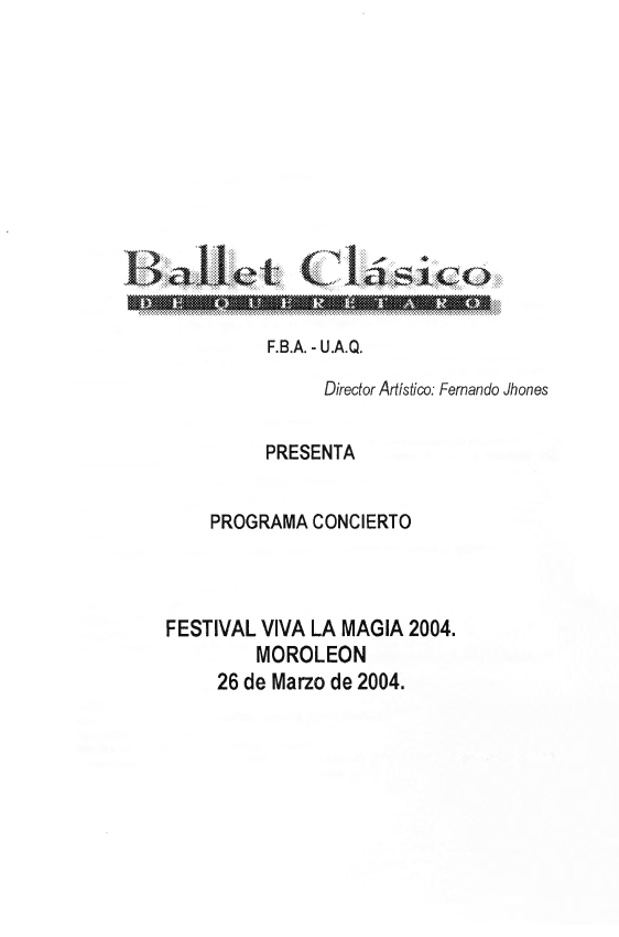 Ballet Clásico de Querétaro Fernando Jhones, “Programa Concierto Festival Viva la Magia 2004 Moroleón,” ReDCA-Ballet, consulta 9 de marzo de 2026, http://redca.uaq.mx/ballet/items/show/580.