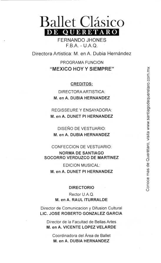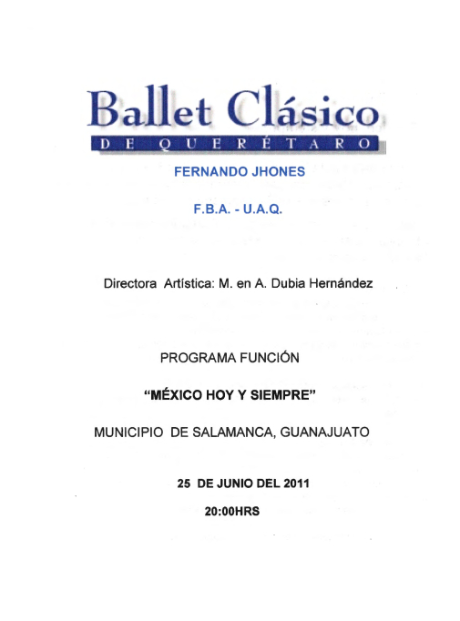 Ballet Clásico de Querétaro Fernando Jhones, “Programa Función México hoy y siempre, Salamanca, Guanajuato,” ReDCA-Ballet, consulta 9 de marzo de 2026, http://redca.uaq.mx/ballet/items/show/587.
