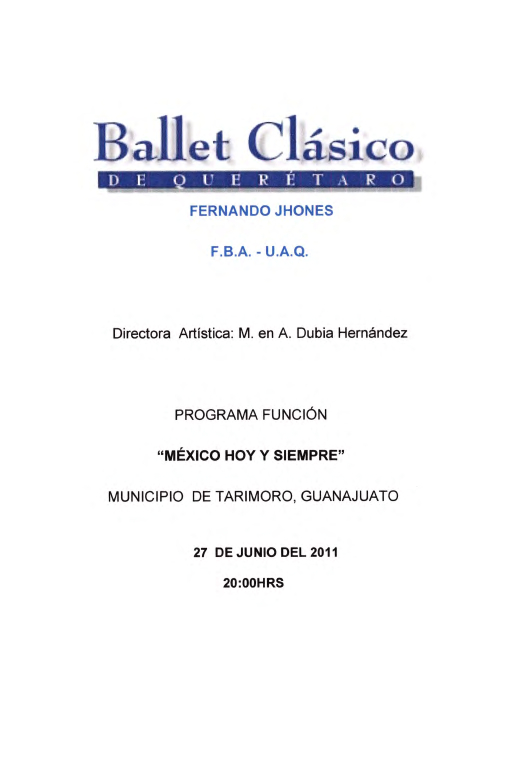 Ballet Clásico de Querétaro Fernando Jhones, “Programa Función México hoy y siempre, Tarimoro, Guanajuato,” ReDCA-Ballet, consulta 9 de marzo de 2026, http://redca.uaq.mx/ballet/items/show/588.