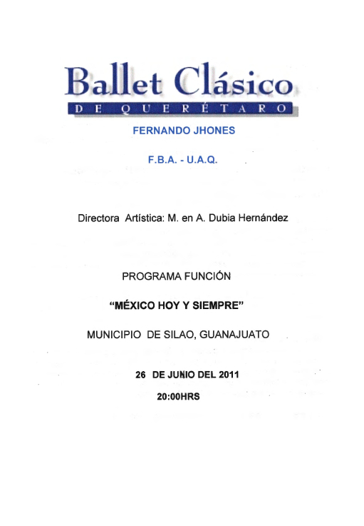 Ballet Clásico de Querétaro Fernando Jhones, “Programa Función México hoy y siempre, Silao, Guanajuato,” ReDCA-Ballet, consulta 9 de marzo de 2026, http://redca.uaq.mx/ballet/items/show/589.